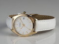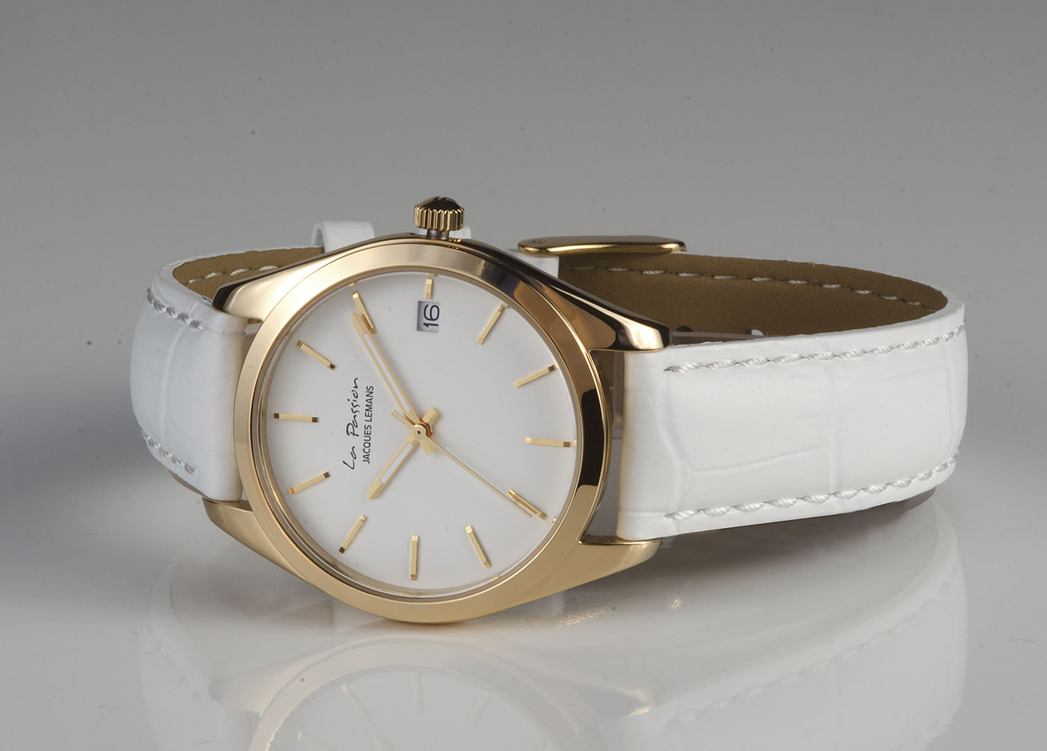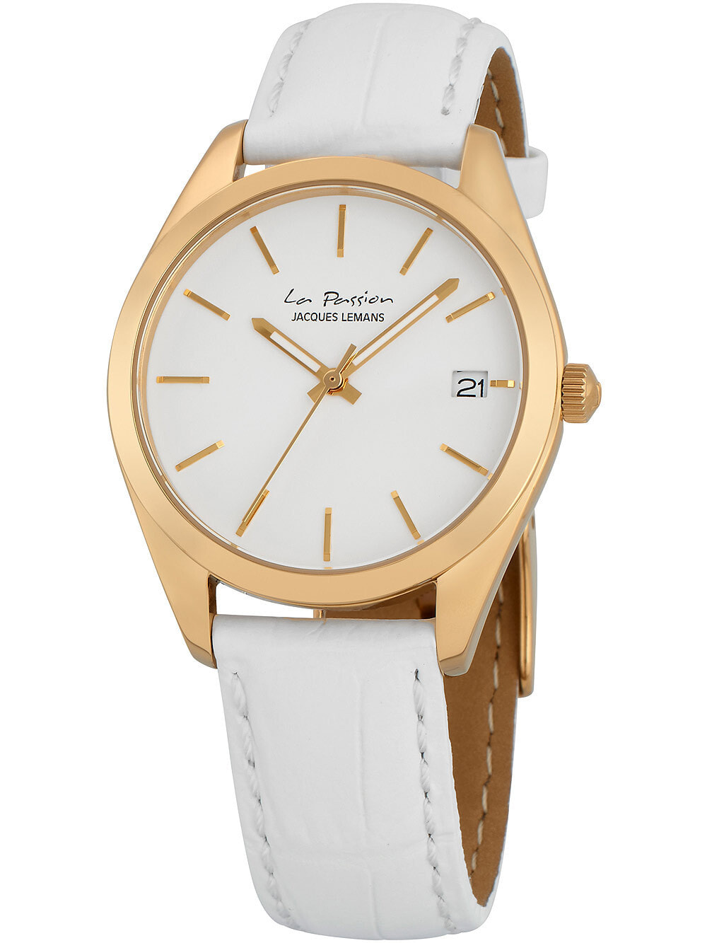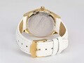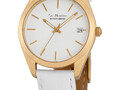 Кварцевая модель из коллекции La Passion очаровывает своей лаконичностью. Тонкий корпус из прочной нержавеющей стали с PVD-покрытием из желтого золота имеет диаметр 34 мм. Он обрамляет белый циферблат с полировкой в виде солнечных лучей. На нем размещены хорошо читаемые риски и индикатор даты в позиции «3 часа». В модели установлено ударопрочное минеральное стекло Crystex. Повышенная водонепроницаемость равна 10 атмосфер. Ремешок выполнен из натуральной кожи белого цвета с застежкой — пряжкой. Эти часы — идеальный аксессуар, который будет уместен практически в любой ситуации, для любого выхода.