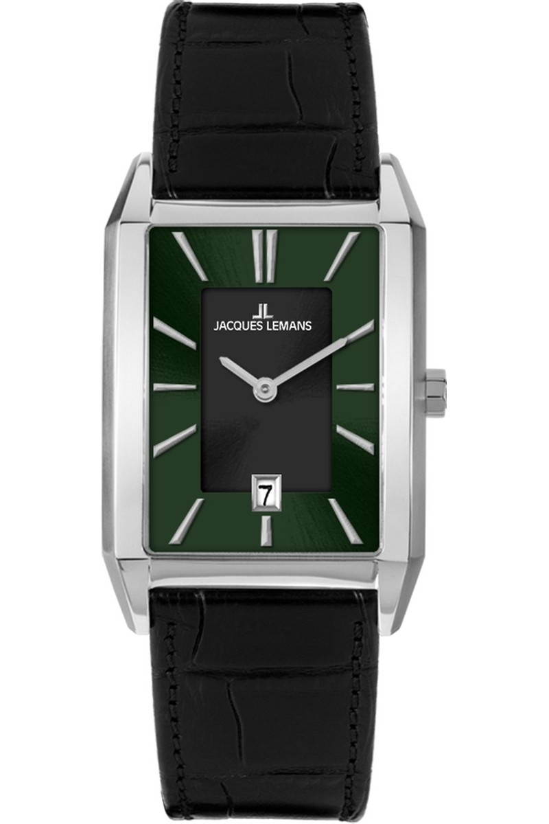 Серия 1-2159 включает классические часы, которые вы будете с удовольствием надевать каждый день. Удобный корпус (30х46 мм) в форме стильного прямоугольника сделан из гипоаллергенной нержавеющей стали, материала, который способен сопротивляться появлению микроцарапин. Минеральное стекло с сапфировым напылением защищает двухуровневый циферблат с комбинацией черного и темно-зеленого цветов. Точно определить время помогут хорошо читаемые риски и стрелки. На 6 часах расположено окошко даты с накладной рамкой. Ремешок сделан из натуральной кожи черного цвета, застежка-пряжка украшена логотипом бренда Jacques Lemans.