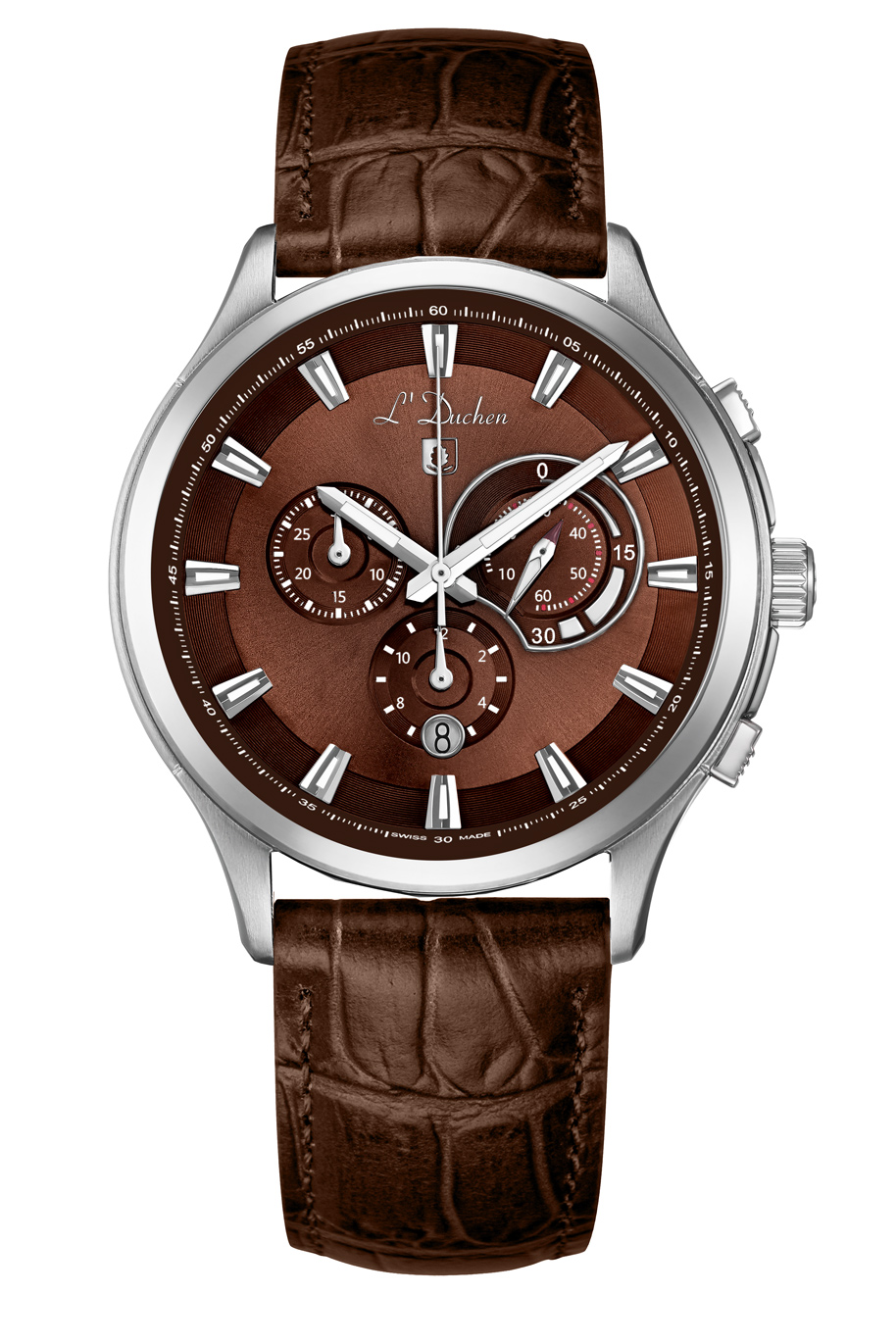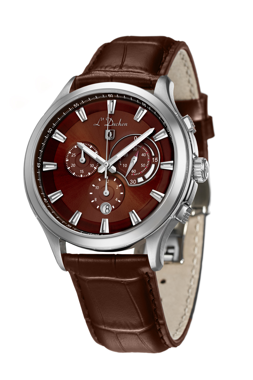 В часах установлен надежный швейцарский механизм с функциями: часы, минуты, секунды, дата, хронограф. Корпус часов изготовлен из гипоаллергенной нержавеющей стали 316L. Размер корпуса 43 мм. Коричневый циферблат создает впечатление глубины и объема, благодаря «колодцу» по внутреннему краю с нанесенной секундной разметкой. По краю циферблата и каждого из индикаторов выполнено гильоше в виде концентрических колец. Дизайн счетчиков, расположенных на циферблате, напоминает приборную панель самолета. Индексы часов выполнены в необычной форме трапеции. Крупные часовая и минутная стрелки хорошо читаются, они, как и риски, покрыты люминесцентным составом SuperLumiNova, известным насыщенностью и продолжительностью свечения. Циферблат надежно защищен прочным и устойчивым к царапинам сапфировым стеклом с антибликовым покрытием. Кнопки хронографа и заводная головка рельефные, что делает их использование удобным и практичным. Водостойкость в часах 10 атмосфер.