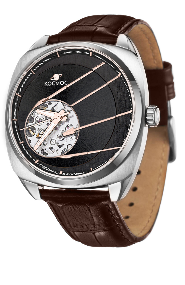 В корпусе необычной формы, сделанном из гипоаллергенной нержавеющей стали, работает механизм Seiko с функцией автоподзавода. Прозрачная задняя крышка надежно закреплена на четырех винтах. Здесь же размещен и индивидуальный номер модели в формате хх/50. Украшением циферблата служит сочетание разных видов полировки и, конечно же, специальная апертура, позволяющая любоваться слаженной работой деталей механизма. Она окружена декоративными элементами, отсылающими к антеннам Спутника. На этом фоне хорошо читаются крупные стрелки, часовая и минутная с люминесцентным покрытием. Для защиты темно-серого циферблата установлено сапфировое стекло, которое надолго сохраняет свою прозрачность, стойко сопротивляясь появлению микроцарапин. Водостойкость равна 10 атмосфер. Корпус дополняет ремешок из натуральной кожи коричневого цвета, застежка-бабочка с двумя боковыми кнопками сделана из нержавеющей стали.