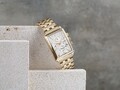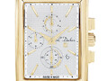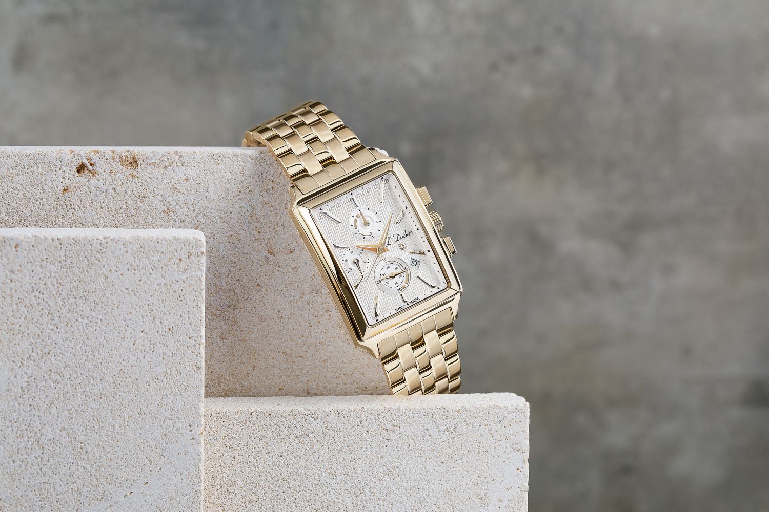 Сапфировое стекло, практически прозрачное, защищает циферблат от внешних воздействий. На внутренней его части — антибликовое покрытие. Оригинальное сочетание зеркальной полировки и матирования позволяет по-новому взглянуть на классическую форму корпуса в виде прямоугольника со скошенными углами. Корпус сделан из гипоаллергенной нержавеющей стали 316L с PVD-покрытием из желтого золота, как и литой браслет. Застежка-бабочка легко раскладывается при нажатии на две боковые кнопки и надежно удерживает аксессуар на запястье.