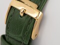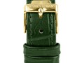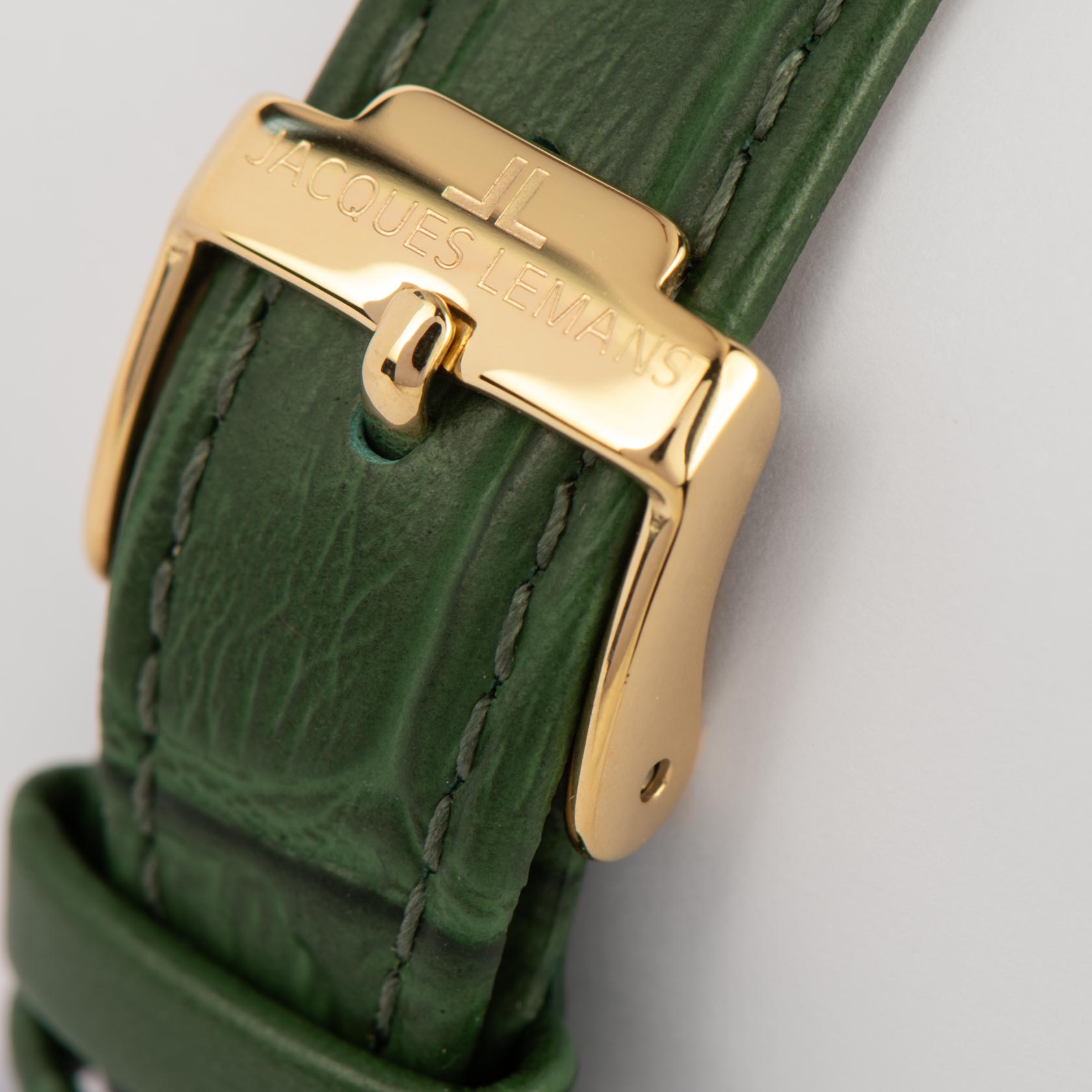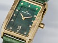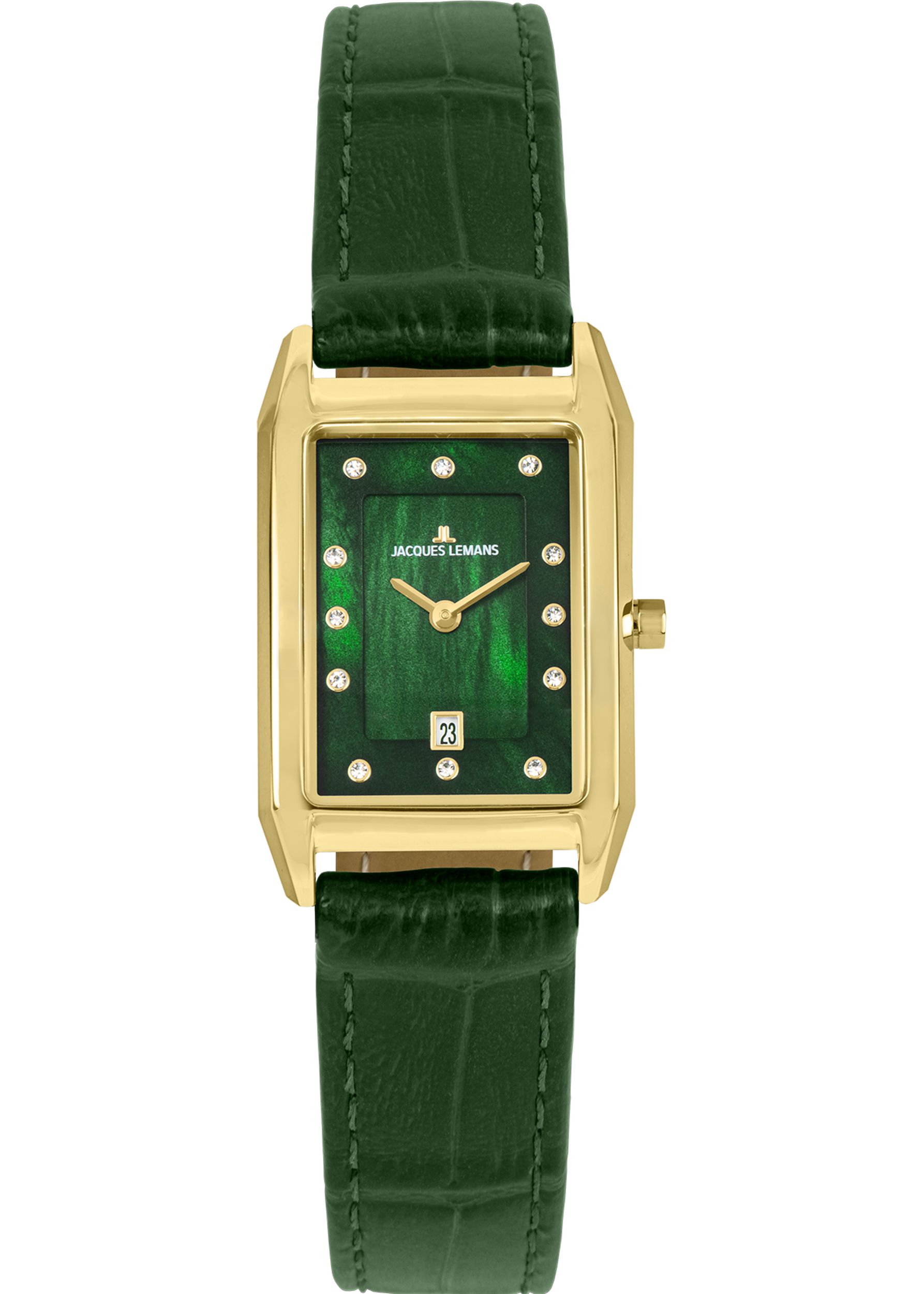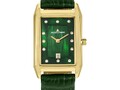 Прямоугольный корпус часов 1-2189 размером 23 на 35 мм будет украшать любое, даже самое изящное запястье. Он сделан из гипоаллергенной нержавеющей стали с PVD-покрытием из желтого золота и зеркальной полировкой. Зеленый циферблат состоит из двух пластин, выполненных из натурального перламутра. Двенадцать кристаллов Swarovski исполняют роль маркеров часов. Кварцевый японский механизм демонстрирует точное время и текущую дату. В модели установлено минеральное стекло. Для ремешка выбрали натуральную кожу зеленого цвета с прошивкой в тон. Стальная застежка-пряжка декорирована логотипом бренда.