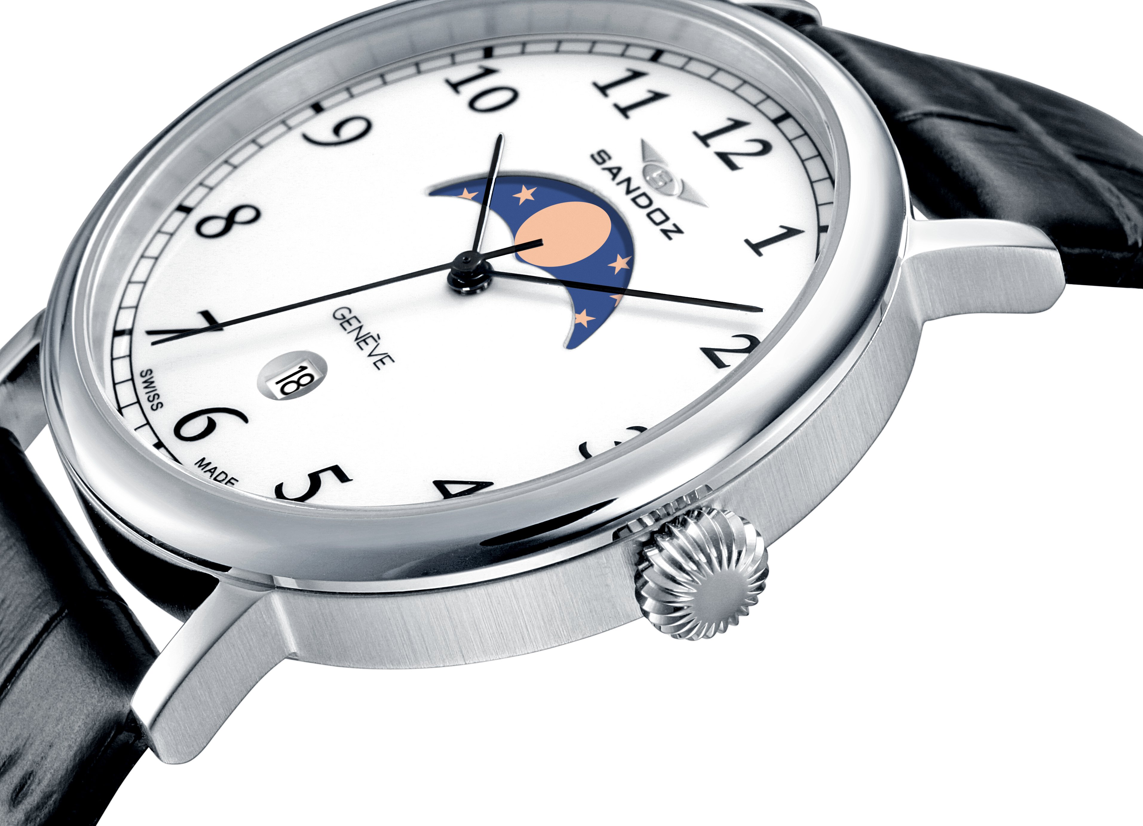 Мужские наручные часы 81435-05 от бренда Сандоз (Швейцария) с гарантией от производителя. Тип стекла — сапфировое. Ремешок черный, материал — натуральная кожа. Механизм кварцевый. Дополнительные функции модели: фаза луны, дата.