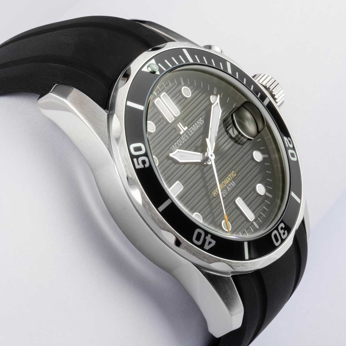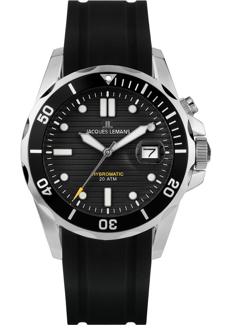 Точный, как кварцевый, функциональный, как автоматический: удивительный гибрид двух механизмов в новых часах от Jacques Lemans. Механизм заряжается при движении руки, обеспечивая запас хода до 180 дней. Корпус диаметром 41 мм дополняет прозрачная задняя крышка и ударопрочное минеральное стекло Crystex. На вращающийся безель нанесена дополнительная индикация. На черном циферблате с горизонтальным гильоше хорошо читаются крупные стрелки и риски. В позиции «3 часа» - окошко даты. Повышенная водостойкость 20 атмосфер (заводная головка завинчивается). Для определения оставшегося запаса хода используется отдельная кнопка над заводной головкой (подробности в инструкции). Ремешок сделан из силикона — современного материала, который не боится повышенной влажности.
