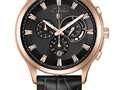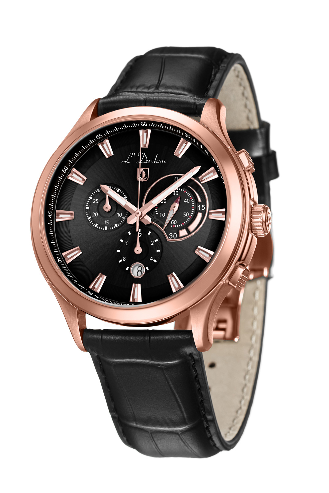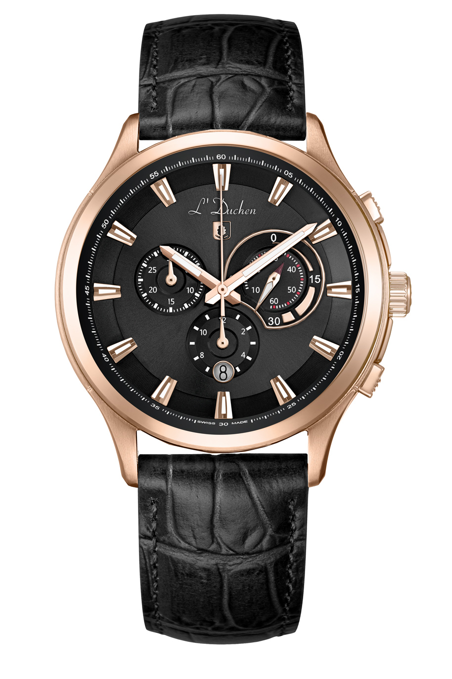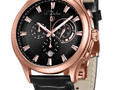 В часах установлен надежный швейцарский механизм с функциями: часы, минуты, секунды, дата, хронограф. Корпус часов изготовлен из гипоаллергенной нержавеющей стали 316L с PVD-покрытием из розового золота. Размер корпуса 43 мм. Черный циферблат создает впечатление глубины и объема, благодаря «колодцу» по внутреннему краю с нанесенной секундной разметкой. По краю циферблата и каждого из индикаторов выполнено гильоше в виде концентрических колец. Дизайн счетчиков, расположенных на циферблате, напоминает приборную панель самолета. Индексы часов выполнены в необычной форме трапеции. Крупные часовая и минутная стрелки хорошо читаются, они, как и риски, покрыты люминесцентным составом SuperLumiNova, известным насыщенностью и продолжительностью свечения. Циферблат надежно защищен прочным и устойчивым к царапинам сапфировым стеклом с антибликовым покрытием. Кнопки хронографа и заводная головка рельефные, что делает их использование удобным и практичным. Водостойкость в часах 10 атмосфер.
