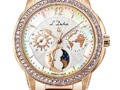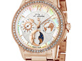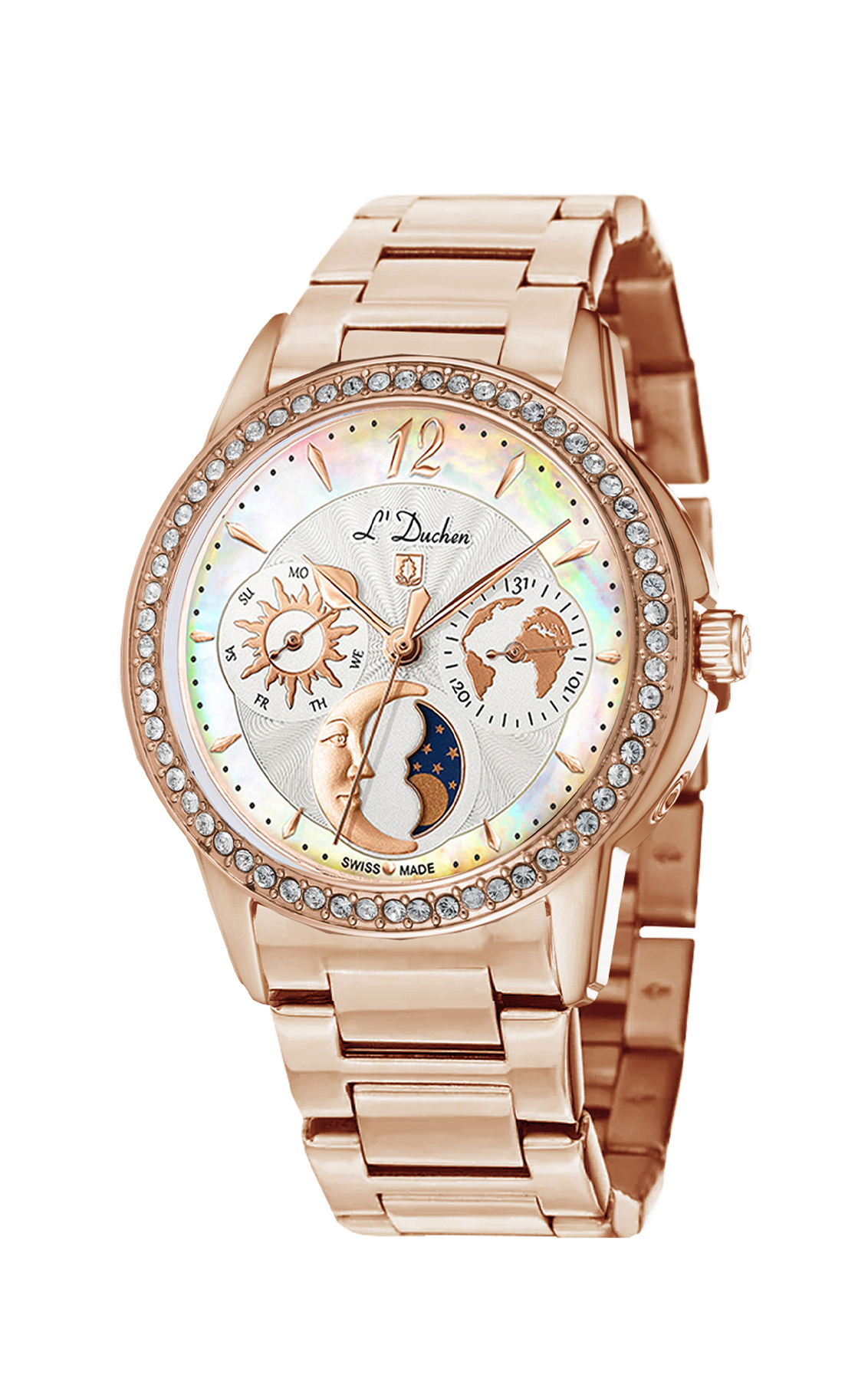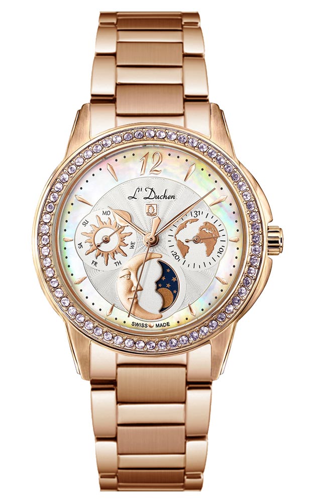 Кварцевый швейцарский механизм надежно скрыт в стальном корпусе круглой формы. Привлекает внимание сочетание матированных и полированных элементов на корпусе. Широкий полированный безель с фианитами интересно играет на свету. Почти невидимое, но стойкое к появлению царапин, сапфировое стекло позволяет любоваться главной изюминкой модели — роскошным циферблатом белого цвета. Центральная часть циферблата декорирована волнообразным гильоше. Индикатор дней недели представлен в виде солнечного диска, индикатор даты украшает изображение карты нашей планеты. Указатель лунных фаз элегантно выделен металлической рамкой и дополнен объемным элементом в виде месяца. И, конечно, неповторимость и уникальность часам придает кольцо из натурального перламутра по краю циферблата. Часы установлены на браслете из нержавеющей стали с PVD-покрытием из розового золота, дополненном раскладной застежкой - «бабочкой» с логотипом бренда. День недели и месяц устанавливаются с помощью скрытой кнопки, которая находится сбоку на корпусе. Разработчики предусмотрительно расположили ее таким образом, чтобы механизм часов не был поврежден в результате частого и некорректного использования кнопки. Водостойкость часов 5 атмосфер. Завинчивающаяся задняя крышка обеспечивает данный уровень защиты от воды.