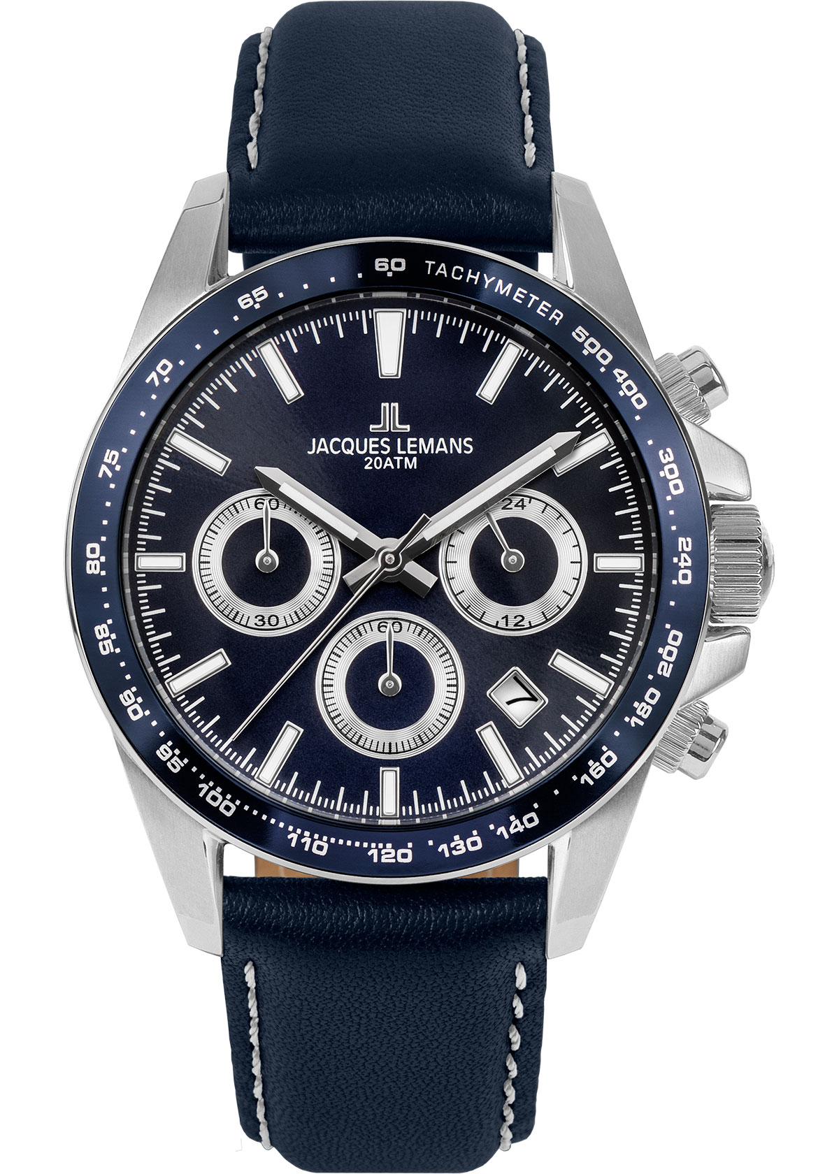 Кварцевые часы в спортивном стиле с повышенной водостойкостью 20 атмосфер. Крупный 41-миллиметровый корпус сделан из нержавеющей стали. Этот прочный материал известен, также, своими гипоаллергенными свойствами. На широкий безель нанесена тахиметрическая шкала. На синем циферблате выделяются хорошо читаемые центральные стрелки часов и минут с люминесцентным покрытием. Предусмотрены дополнительные индикаторы: минутный и секундный накопители и индикатор 24-х часов. Между 4 и 5 часами — окошко даты. В модели установлено ударопрочное минеральное стекло Crystex. Повышенная водостойкость в 20 атмосфер обеспечивается завинчивающимися заводной головкой и крышкой. Ремешок синего цвета из натуральной кожи дополнен прошивкой, что повышает его стойкость к износу. Функциональные и эффектные, часы Jacques Lemans станут вашим надежным помощником как в офисе, так и во время занятий спортом.