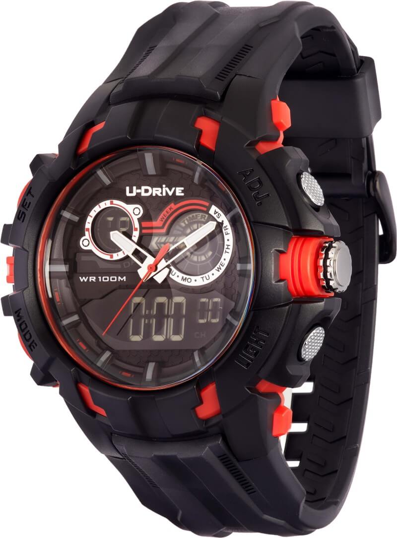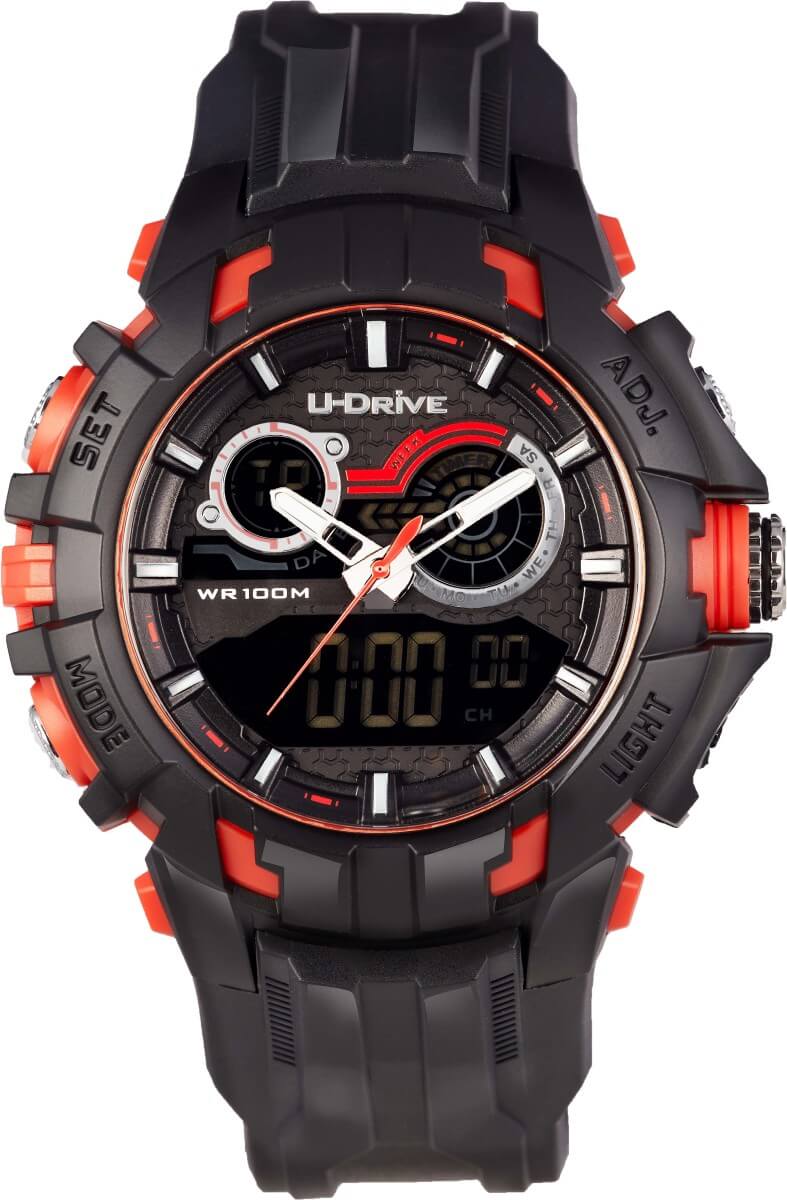 Часы U-Drive – надежный спутник активных и энергичных, тех, кто выбирает экстрим и свободу. Поэтому водостойкость модели повышенная — 10 атмосфер, а задняя крышка закреплена на винтах. В часах можно плавать и заниматься водными видами спорта. Во время тренировок, походов с палатками или в клуб, просто на прогулке с друзьями — часы U-Drive везде будут уместны. Их дизайн легко сочетается со спортивной формой или любой другой повседневной одеждой.