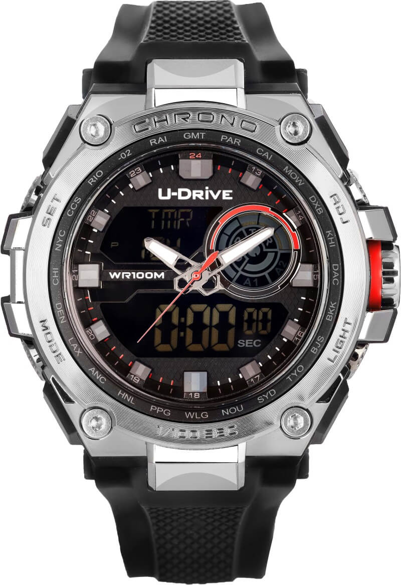 Часы U-Drive – надежный спутник активных и энергичных, тех, кто выбирает экстрим и свободу. Поэтому водостойкость модели повышенная — 10 атмосфер, а задняя крышка закреплена на винтах. В часах можно плавать и заниматься водными видами спорта. Во время тренировок, походов с палатками или в клуб, просто на прогулке с друзьями — часы U-Drive везде будут уместны. Их дизайн легко сочетается со спортивной формой или любой другой повседневной одеждой.