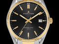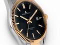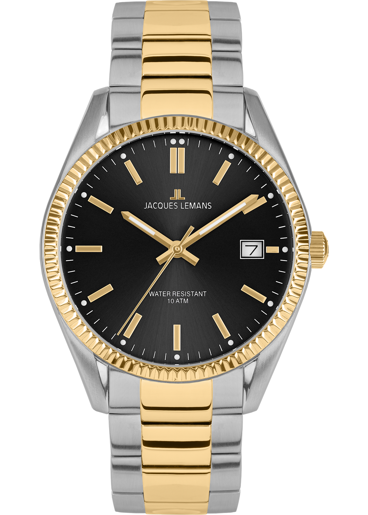 Выпуск этой серии посвящен 50-летию со дня основания бренда Jacques Lemans. Серьезная дата, которая говорит об успехе и десятилетиях накопленного опыта в производстве часов. Для модели 50-3 был выбран 40-миллиметровый корпус из нержавеющей стали с привлекающим внимание безелем. Рельеф, зеркальная полировка и PVD-покрытие из желтого золота, которыми он украшен, служат достойным обрамлением широкому циферблату черного цвета. На нем расположены четкие линии рисок и центральных стрелок. Стрелки часов и минут, а также риски будут хорошо читаться даже в темноте, благодаря тому, что они выделены люминесцентным покрытием. Кварцевый механизм часов предусматривает и индикацию текущей даты. Водостойкость равна 10 атмосфер. Браслет состоит из стальных звеньев и надежной застежки-клипсы с двумя боковыми кнопками и дополнительной защитой от случайного расстегивания.