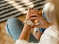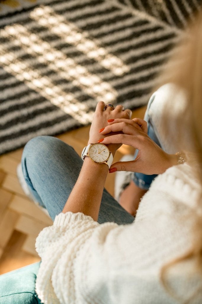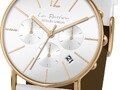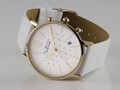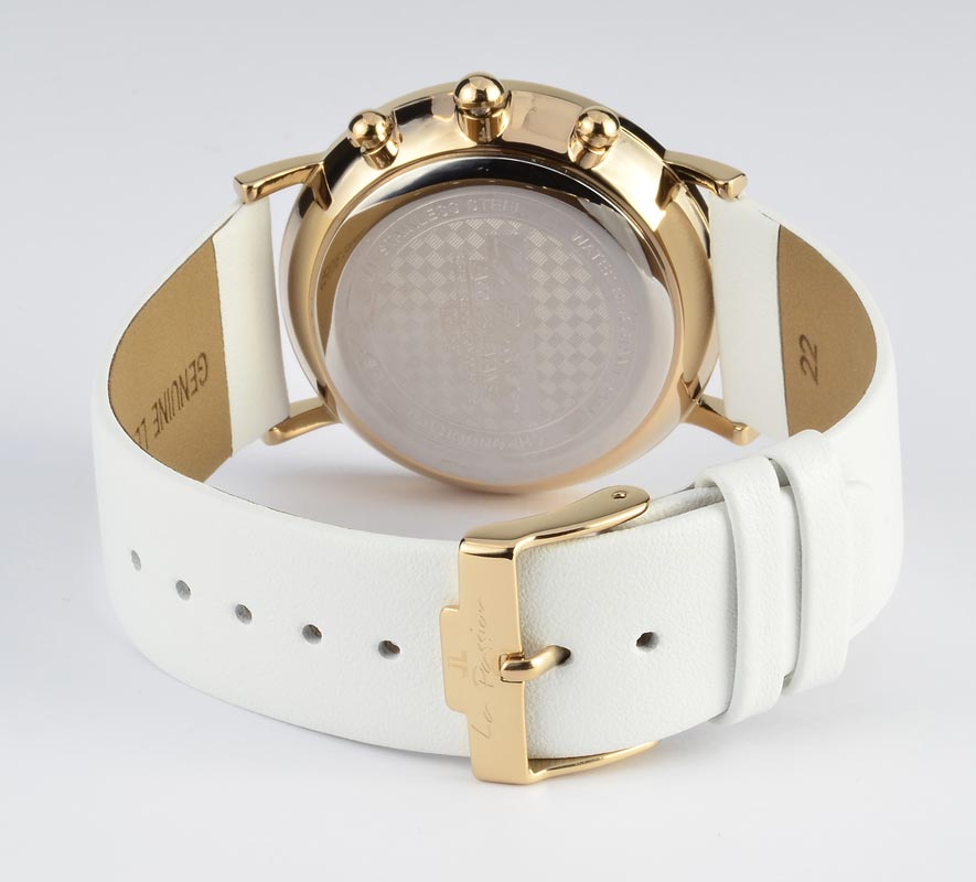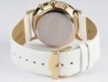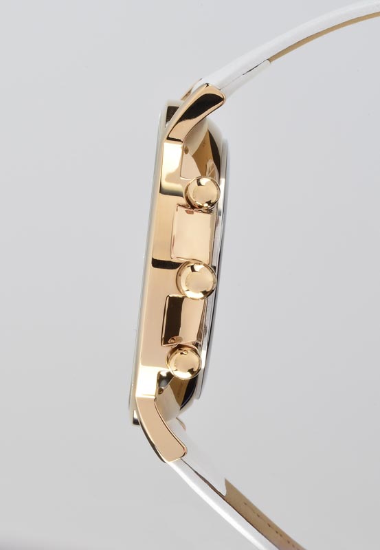 Женский кварцевый хронограф создан в лучших традициях минимализма. На матовом циферблате размещены индикаторы вынесенной секундной стрелки, 30-минутного накопителя и индикатора 24 часов. Апертура даты расположилась в положении «4» часов. Кнопки хронографа и заводная головка идеально круглой формы, что великолепно сочетается с линиями корпуса и не противоречит выбранному стилю. Модель представлена на белом ремешке из натуральной кожи классических оттенков, корпус часов изготовлен из гипоалергенной стали с PVD-покрытием желтого золота.