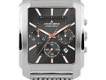 Кварцевые часы отличает необычная форма корпуса из нержавеющей стали — вытянутый прямоугольник с выступающими боковыми частями, на одной из которых размещены лаконичные кнопки хронографа и заводная головка.