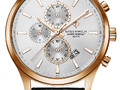 43-миллиметровый корпус часов сделан из нержавеющей стали с PVD-покрытием из розового золота, а ремешок — из натуральной кожи с прошивкой.