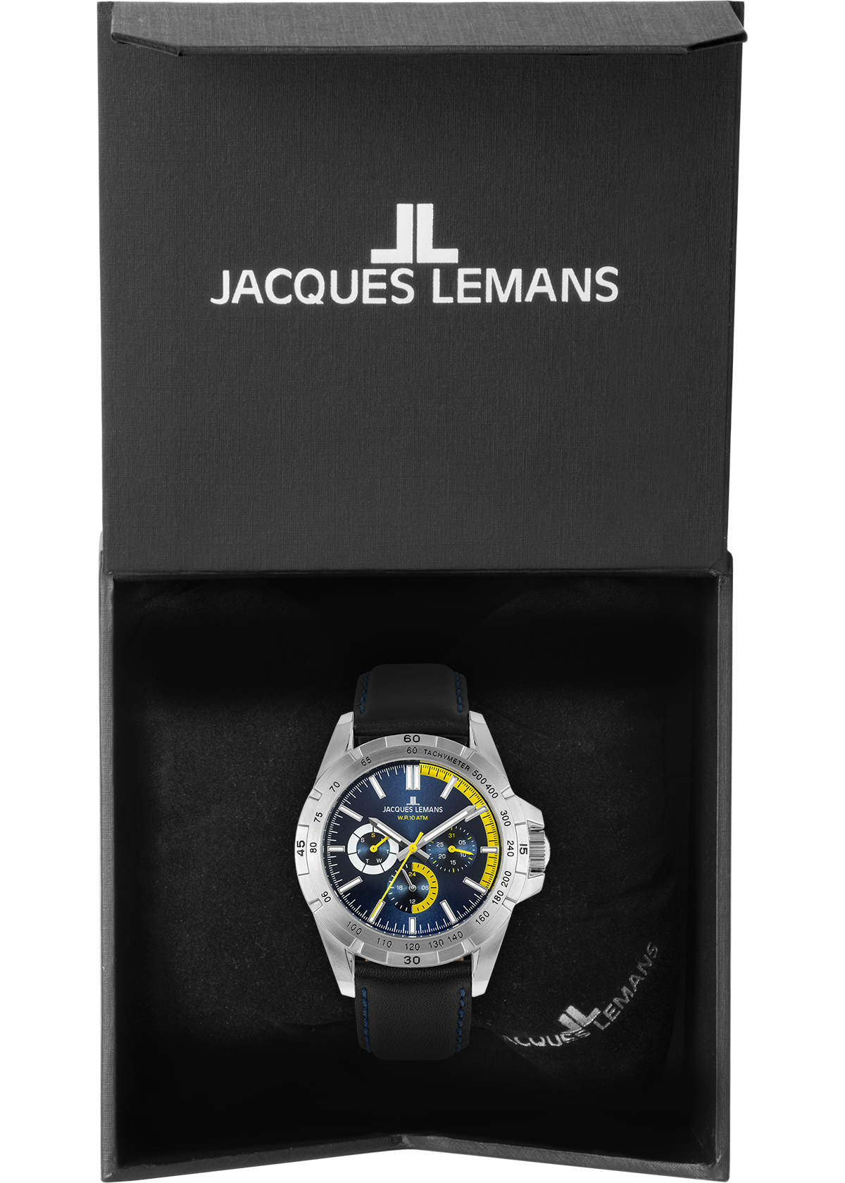 Выраженный спортивный характер дизайна придает особую привлекательность часам серии 42-11. 41-миллиметровый корпус оснащен широким рельефным безелем: на нем разместили тахиметрическую шкалу и дополнительную индикацию секунд. Синий циферблат, несмотря на обилие деталей, легко читается. Помогают в этом ярко-желтые акценты и люминесцентное покрытие часовой, минутной стрелок и рисок, которое светится в темноте. Кварцевый механизм предлагает несколько полезных функций, таких как дата, день недели и индикатор 24-х часов. Ударопрочное минеральное стекло Crystex защищает циферблат от внешних воздействий. 10 атмосфер водостойкости позволяют плавать в часах, не боясь проникновения влаги в механизм. Заводная головка дополнительно защищена — это предусмотрено конструкцией корпуса. Ремешок сделан из натуральной кожи черного цвета.