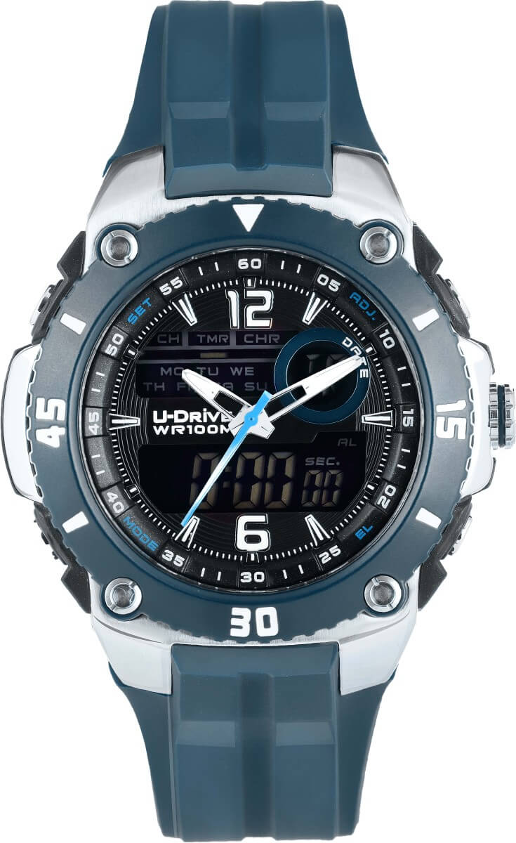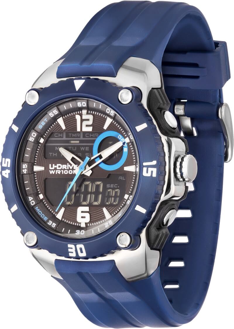 Часы U-Drive – надежный спутник активных и энергичных, тех, кто выбирает экстрим и свободу. Поэтому водостойкость модели повышенная — 10 атмосфер, а задняя крышка закреплена на винтах. В часах можно плавать и заниматься водными видами спорта. Во время тренировок, походов с палатками или в клуб, просто на прогулке с друзьями — часы U-Drive везде будут уместны. Их дизайн легко сочетается со спортивной формой или любой другой повседневной одеждой.