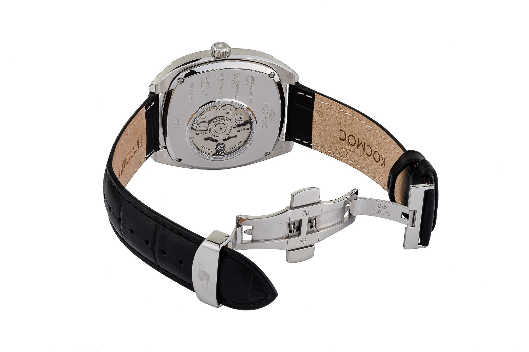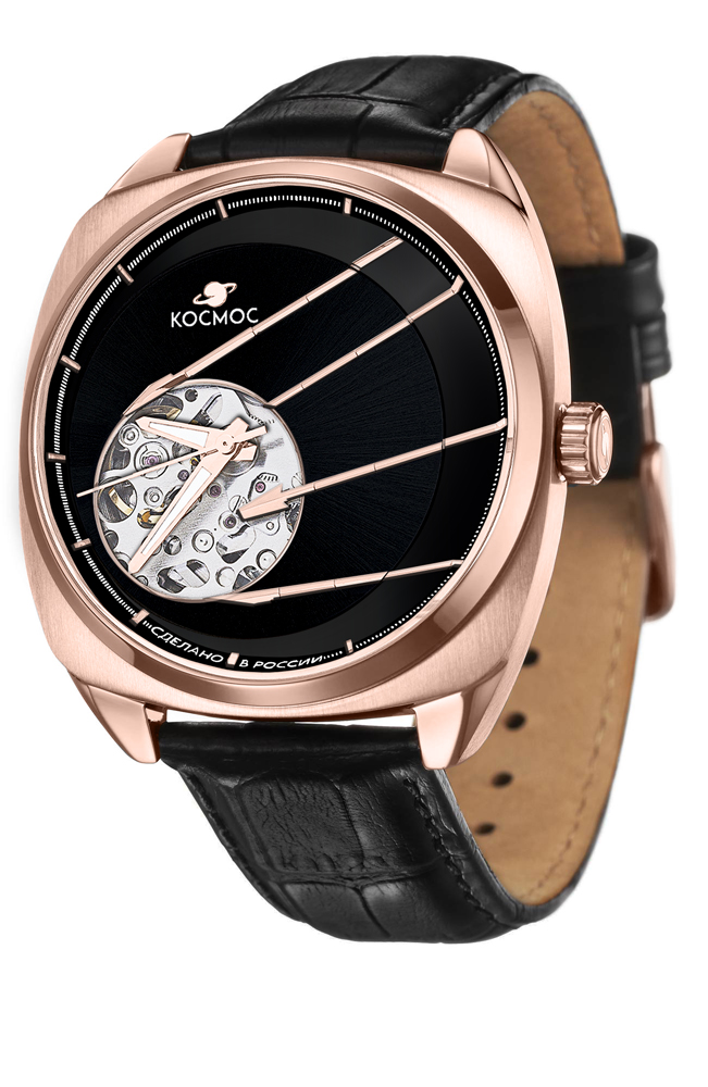 В корпусе необычной формы, сделанном из гипоаллергенной нержавеющей стали с PVD-покрытием из розового золота, работает механизм Seiko с функцией автоподзавода. Прозрачная задняя крышка надежно закреплена на четырех винтах. Здесь же размещен и индивидуальный номер модели в формате хх/50. Украшением циферблата служит сочетание разных видов полировки и, конечно же, специальная апертура, позволяющая любоваться слаженной работой деталей механизма. Она окружена декоративными элементами, отсылающими к антеннам Спутника. На этом фоне хорошо читаются крупные стрелки, часовая и минутная с люминесцентным покрытием. Для защиты черного циферблата установлено сапфировое стекло, которое надолго сохраняет свою прозрачность, стойко сопротивляясь появлению микроцарапин. Водостойкость равна 10 атмосфер. Корпус дополняет ремешок из натуральной кожи черного цвета, застежка-бабочка с двумя боковыми кнопками сделана из нержавеющей стали.