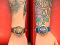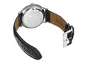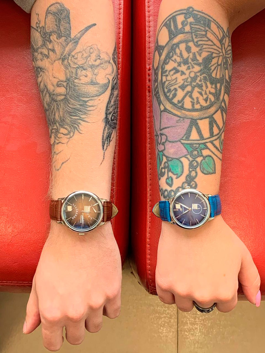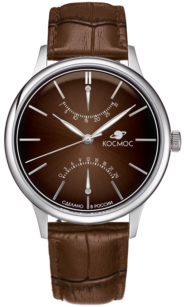 Секундная стрелка выгнута, что соответствует форме самого циферблата. На стальной задней крышке выгравирован сюжет-фантазия о космическом будущем человека. Заводная головка украшена логотипом бренда: стилизованным изображением планеты с орбитой космического корабля.