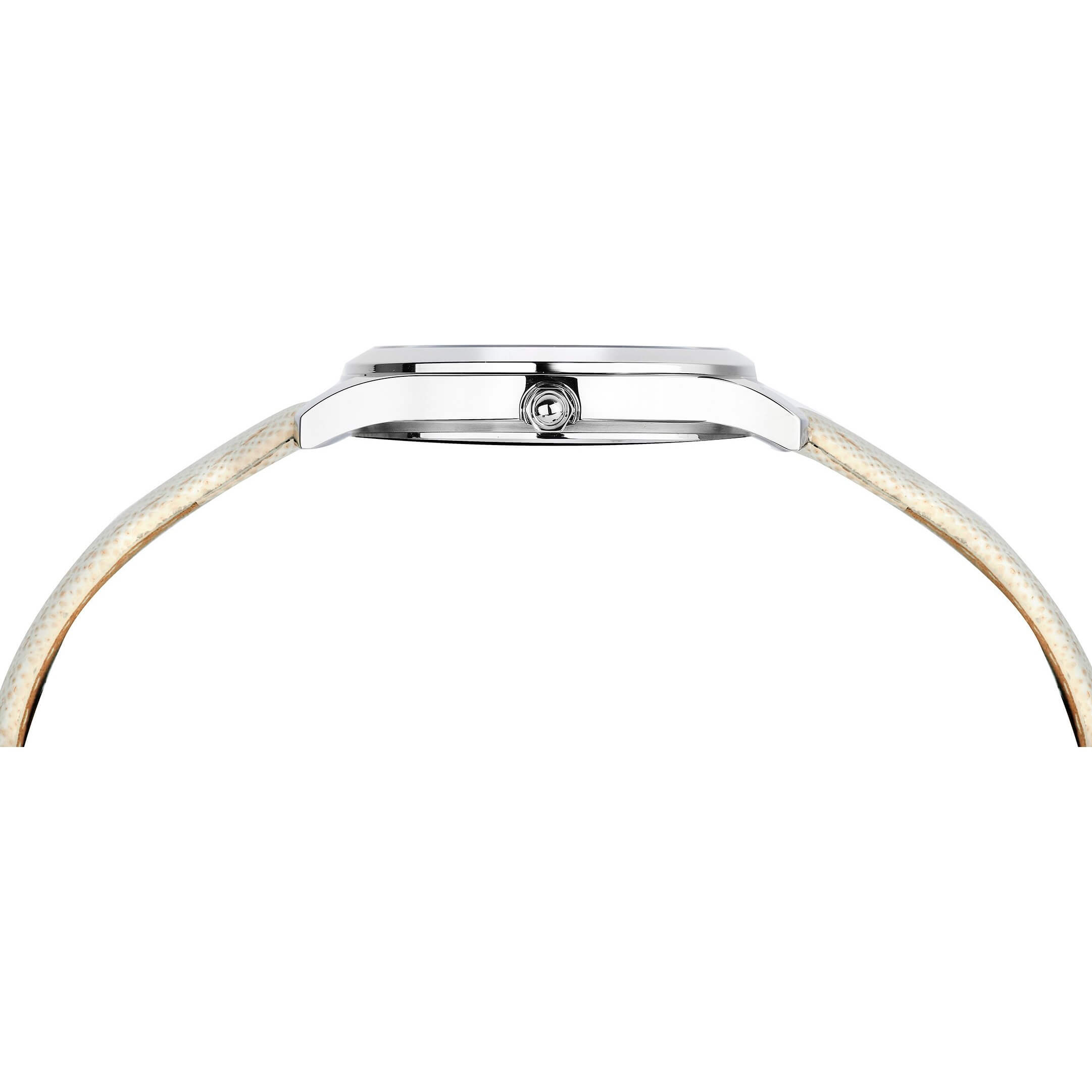 Стальной корпус с полированным безелем превосходно сочетается с ремешком из натуральной кожи, цвет которого перекликается с оттенком циферблата. Бесперебойную работу часов обеспечивает кварцевый швейцарский механизм.
