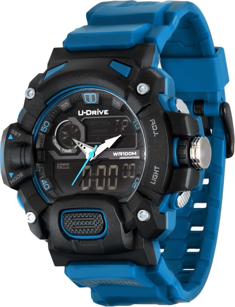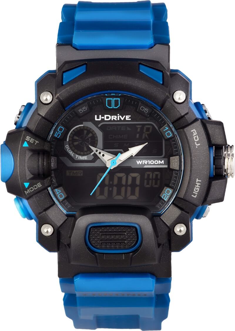 Часы U-Drive – надежный спутник активных и энергичных, тех, кто выбирает экстрим и свободу. Поэтому водостойкость модели повышенная — 10 атмосфер, а задняя крышка закреплена на винтах. В часах можно плавать и заниматься водными видами спорта. Во время тренировок, походов с палатками или в клуб, просто на прогулке с друзьями — часы U-Drive везде будут уместны. Их дизайн легко сочетается со спортивной формой или любой другой повседневной одеждой.