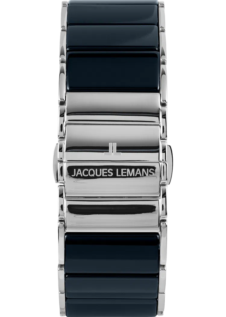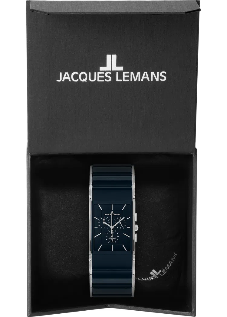 У стильного хронографа Jacques Lemans несколько важных преимуществ. Прямоугольная форма корпуса из нержавеющей стали оригинально смотрится и удобно лежит на запястье. Звенья браслета сделаны из высокотехнологичной керамики: этот современный материал стойко сопротивляется появлению микроцарапин и надолго сохраняет естественный блеск. Хорошо читается синий циферблат с дополнительными индикаторами хронографа и окошком даты.