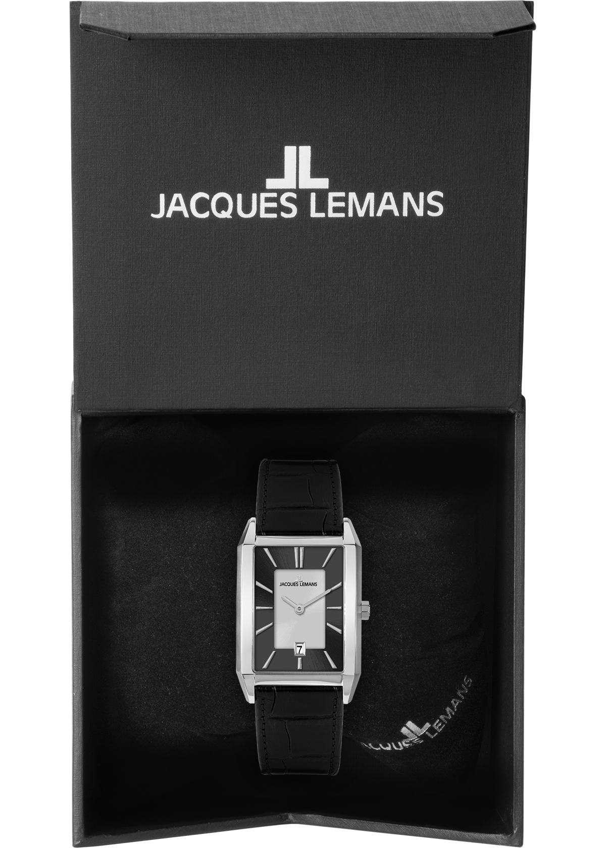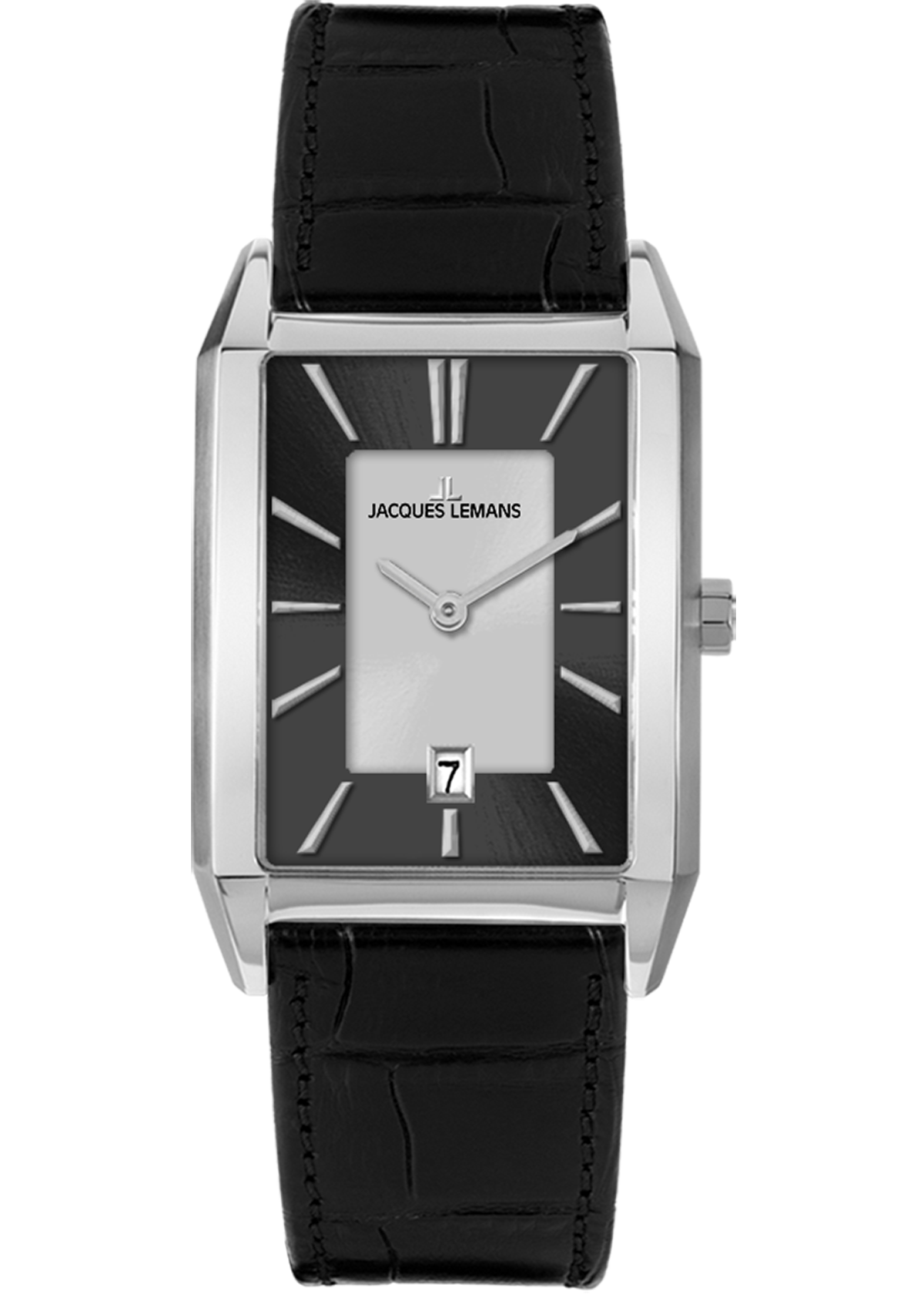 Серия 1-2159 включает классические часы, которые вы будете с удовольствием надевать каждый день. Удобный корпус (30х46 мм) в форме стильного прямоугольника сделан из гипоаллергенной нержавеющей стали, материала, который способен сопротивляться появлению микроцарапин. Минеральное стекло с сапфировым напылением защищает двухуровневый циферблат с контрастным сочетанием черного и серого. Точно определить время помогут хорошо читаемые риски и стрелки. На 6 часах расположено окошко даты с накладной рамкой. Ремешок сделан из натуральной кожи черного цвета, застежка-пряжка украшена логотипом бренда Jacques Lemans.