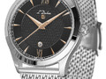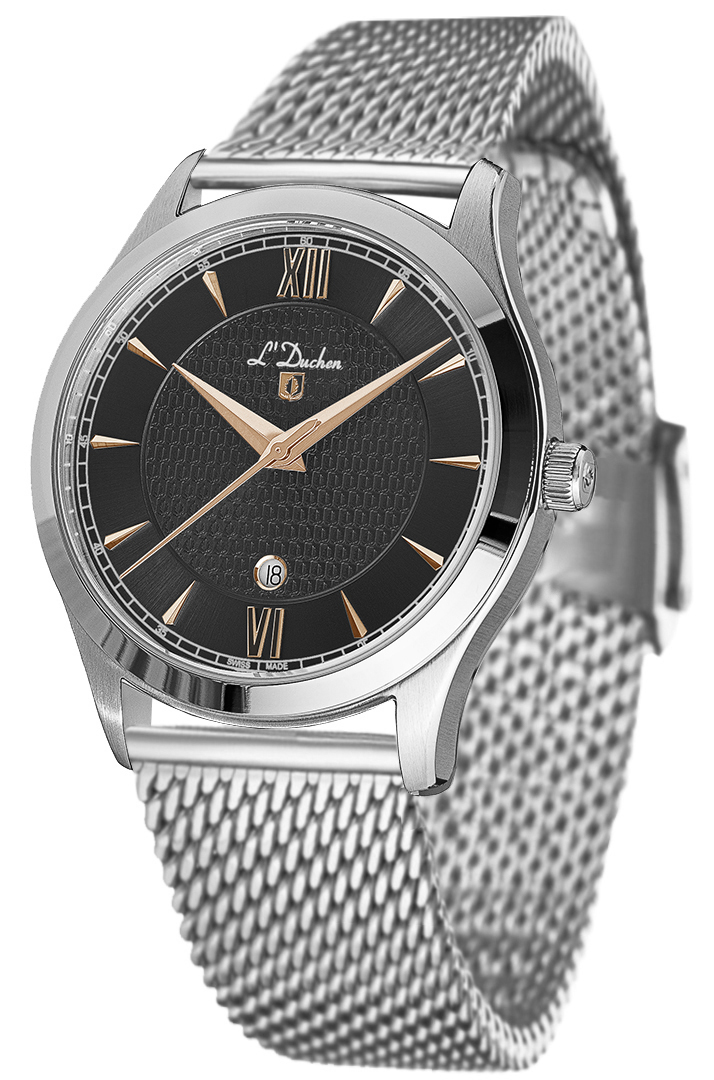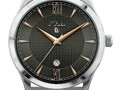 Центральная часть черного циферблата декорирована гильоше в виде паттернов дубового листа. На матовое кольцо вынесены индексы часов, которые изготовлены вручную в форме пирамидок. На уровне шести часов расположен индикатор даты. Благодаря мечеобразной форме часовая и минутная стрелки смотрятся объемно и хорошо читаются. Сапфировое стекло надежно защищает циферблат часов.