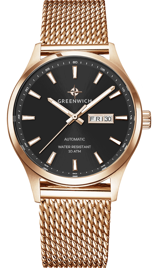 Премьерную коллекцию автоматических часов бренда Greenwich открывает серия Good Luck. Классический корпус диаметром 43 мм с полированным безелем и PVD-покрытием из розового золота обрамляет циферблат часов. Полировка в виде солнечных лучей и крупные риски, сдвоенное окошко даты и люминесцентное покрытие часовой и минутной стрелок: черный циферблат эффектно смотрится, функционален и легко читается при любом освещении. Водостойкость равна 10 атмосфер: в этих часах можно плавать. Сквозь прозрачную заднюю крышку вы увидите детали механизма TMI с декорированным ротором: на нем выгравировано изображение символа английских моряков — парусника и название коллекции. Браслет миланского плетения выполнен из нержавеющей стали, специальная застежка позволяет самостоятельно регулировать длину браслета. Дизайн, актуальный для любого современного образа, и надежность используемых материалов делают автоматические часы Greenwich удобным и стильным аксессуаром на каждый день.