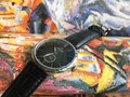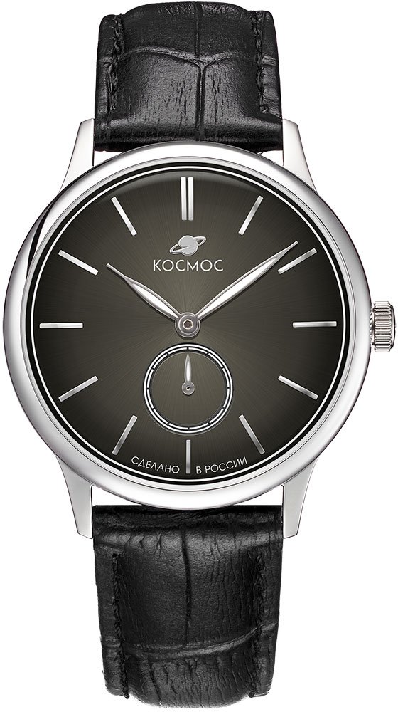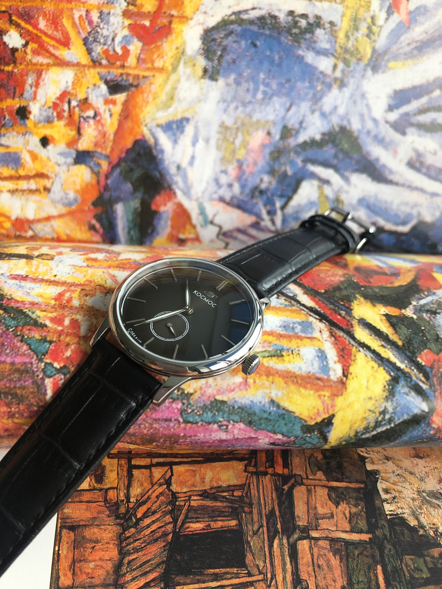 Особую глубину циферблату черного цвета придает эффект градиента. Хорошо читаются крупные часовая и минутная стрелки. Индикация секунд вынесена в нижнюю часть циферблата. На стальной задней крышке выгравирован сюжет-фантазия о космическом будущем человека. Заводная головка украшена логотипом бренда: стилизованным изображением планеты с орбитой космического корабля.