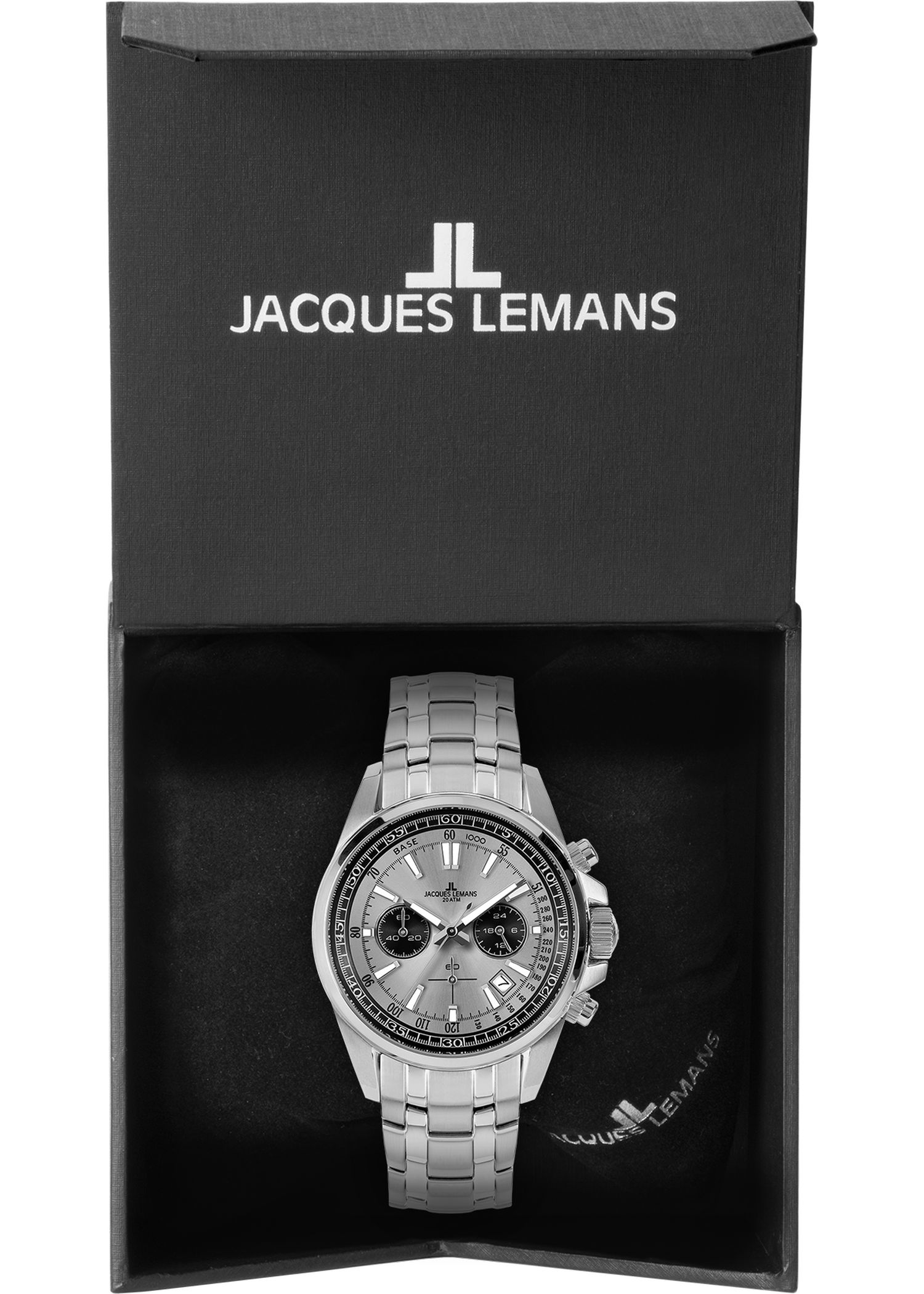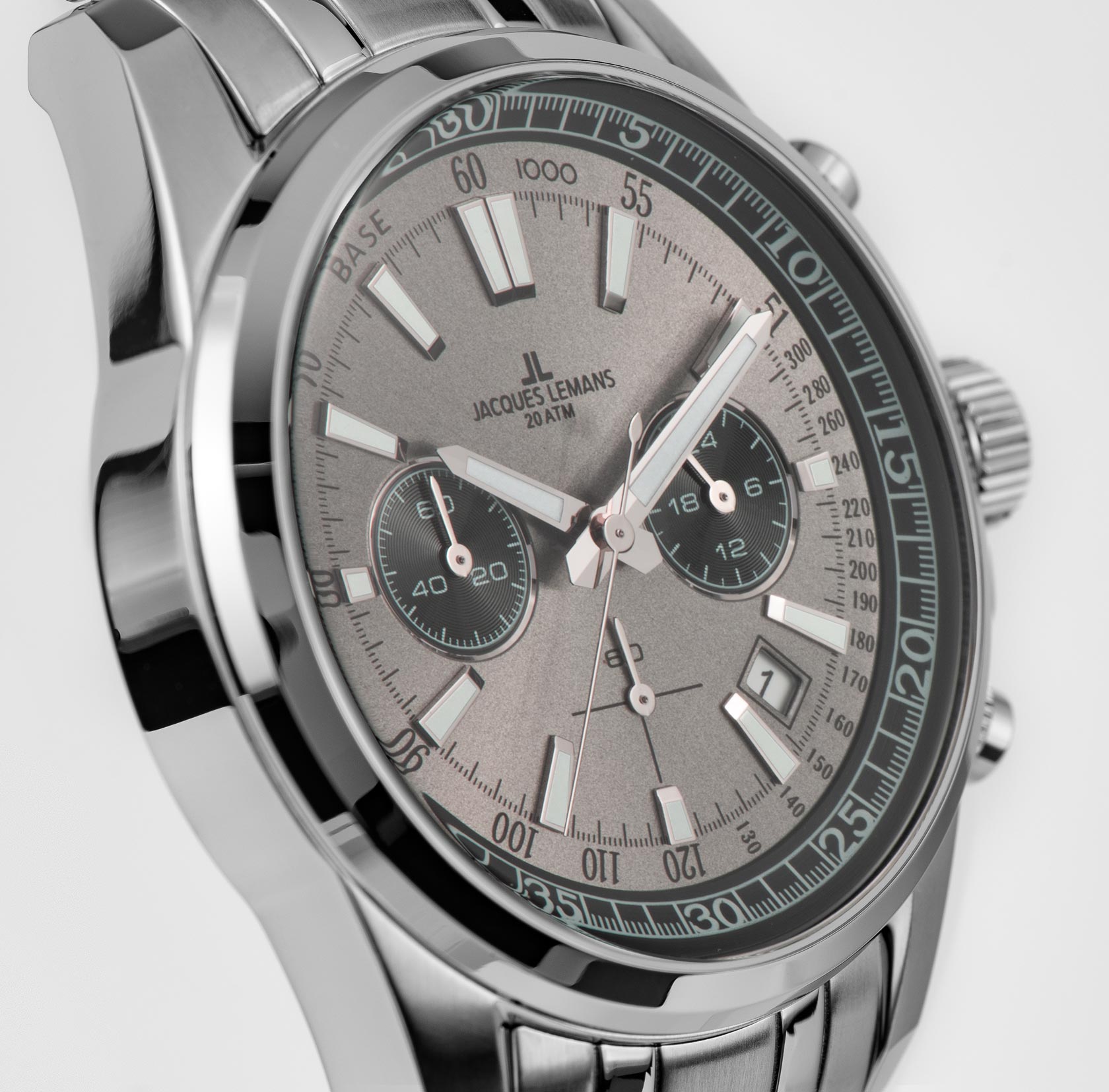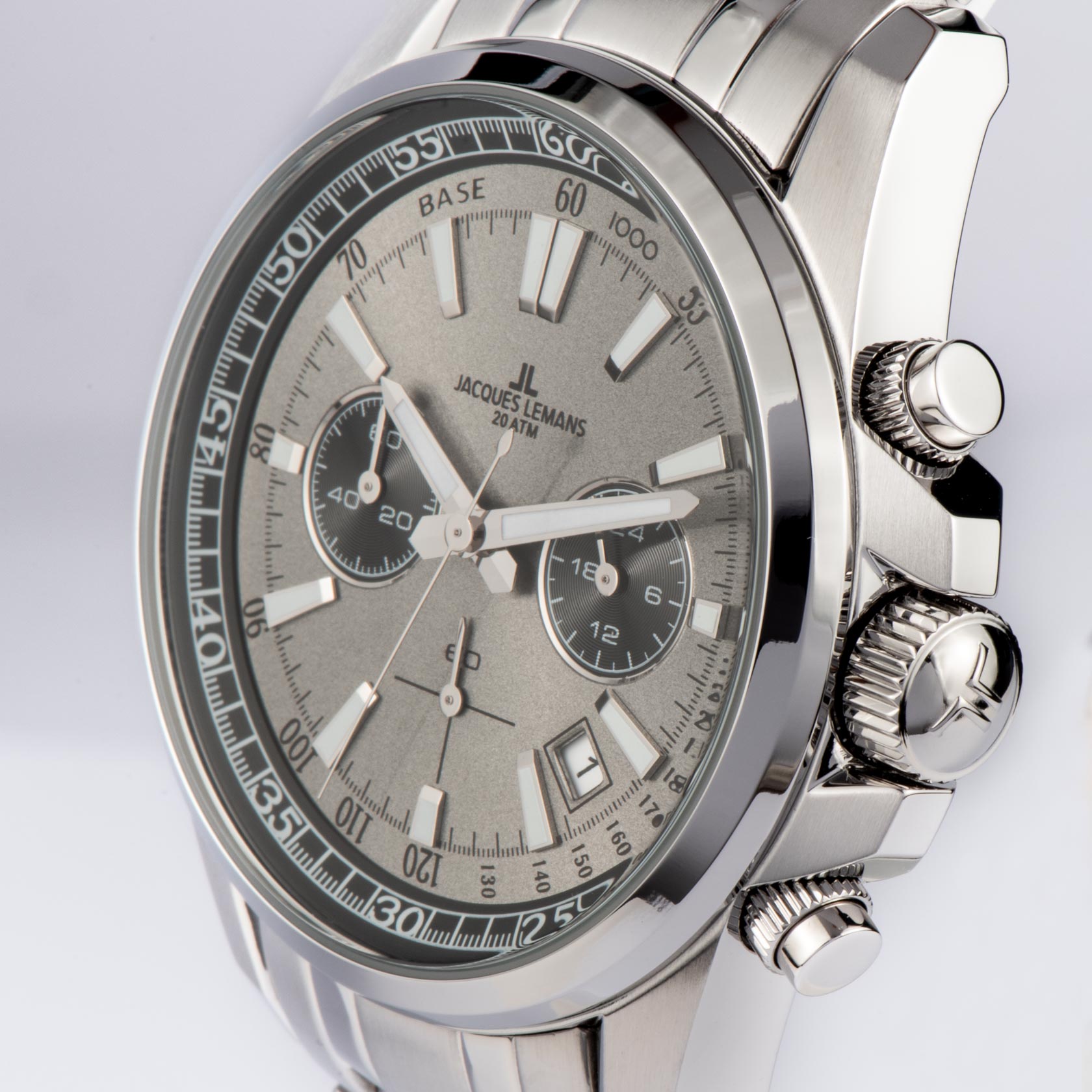 Кнопки хронографа продуманного размера удобно использовать, а для рельефной заводной головки предусмотрена дополнительная защита. На серо-черном циферблате с полировкой в виде солнечных лучей расположены крупные часовая и минутная стрелки и риски с люминесцентным покрытием, которое помогает определить время даже в темноте. Хорошо читаются дополнительные индикаторы 24-х часов, счетчики минут и секунд, окошко даты.