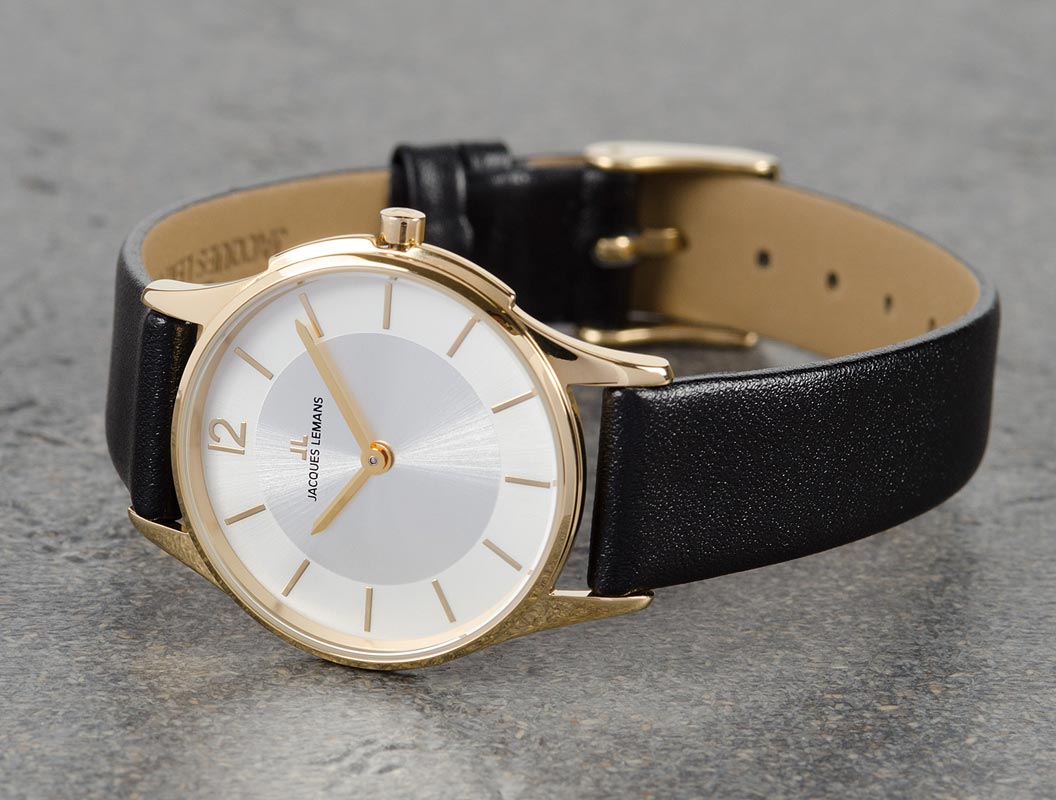 Изящные и лаконичные кварцевые часы от Jacques Lemans выполнены в классическом стиле. На циферблате две стрелки, часовая и минутная, дизайн индикации времени зависит от модели: это могут быть арабские цифры, сочетание рисок и арабских цифр, кристаллы Swarovski. Часы дополняет матовый ремешок из натуральной кожи, стальная застежка которого украшена логотипом бренда. Внутри корпуса из антиаллергенной нержавеющей стали — надежный японский механизм.