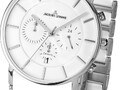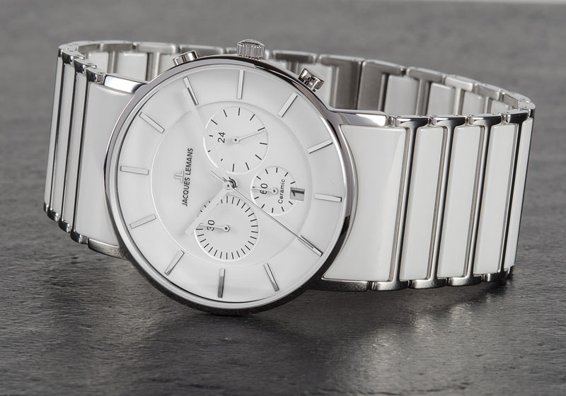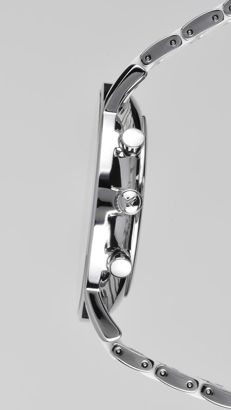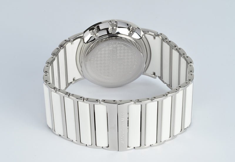 Кварцевый мужской хронограф отличается тонким корпусом из стали. На циферблате расположены индикаторы 24-часов, 30-минутный накопитель, вынесенная секундная стрелка и дата. Небольшой размер кнопок хронографа и заводной головки подчеркивают элегантность модели. Центральные звенья браслета выполнены из высокотехнологичной керамики белого цвета. Этот стойкий к появлению микроцарапин материал позволяет на долгое время сохранить превосходный внешний вид часов, а использование стальных звеньев по бокам браслета увеличивает его прочность. В часах установлено сапфировое стекло.