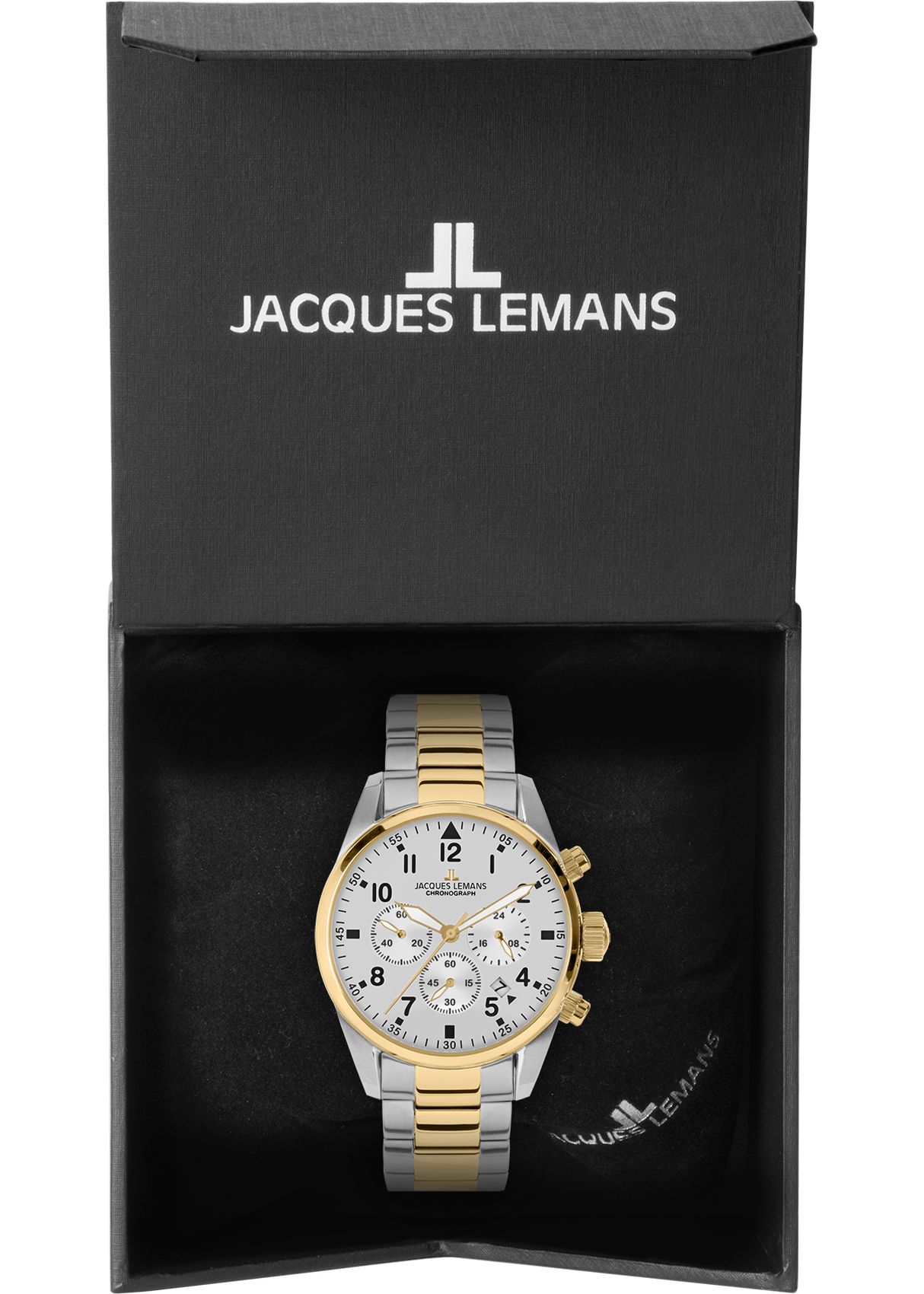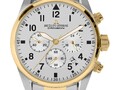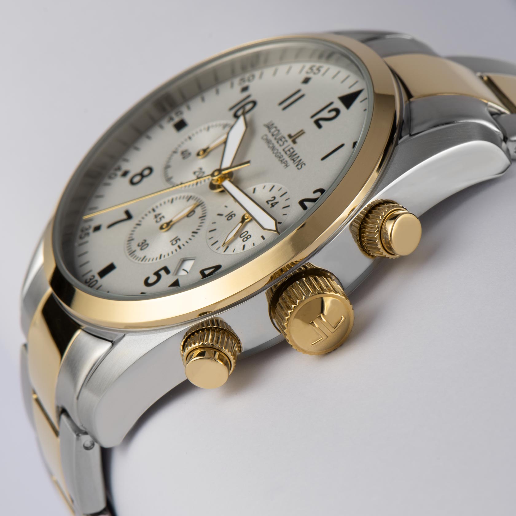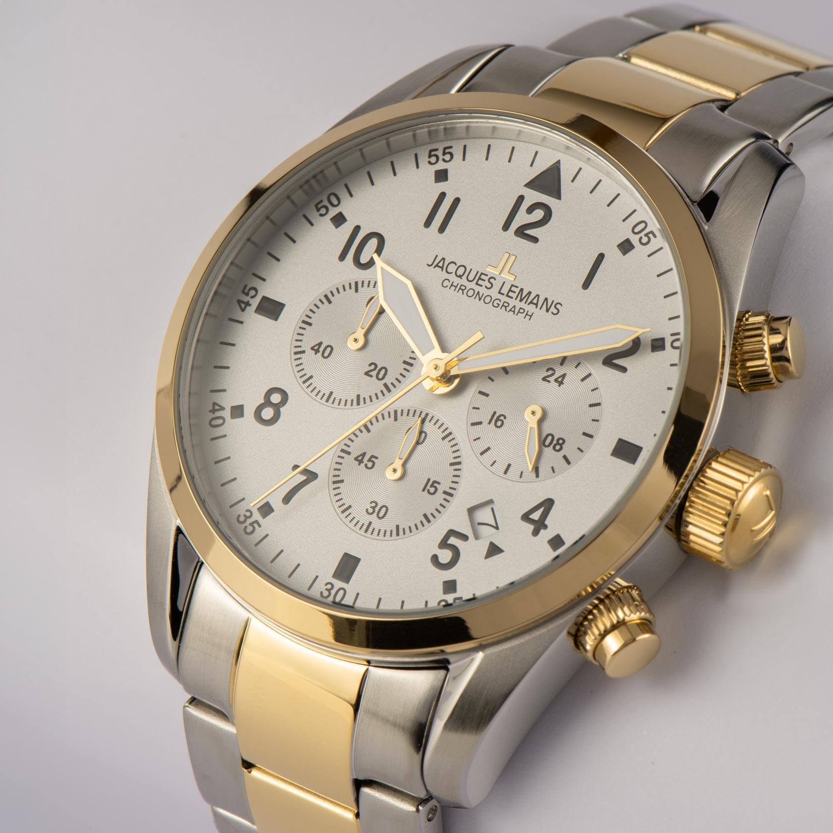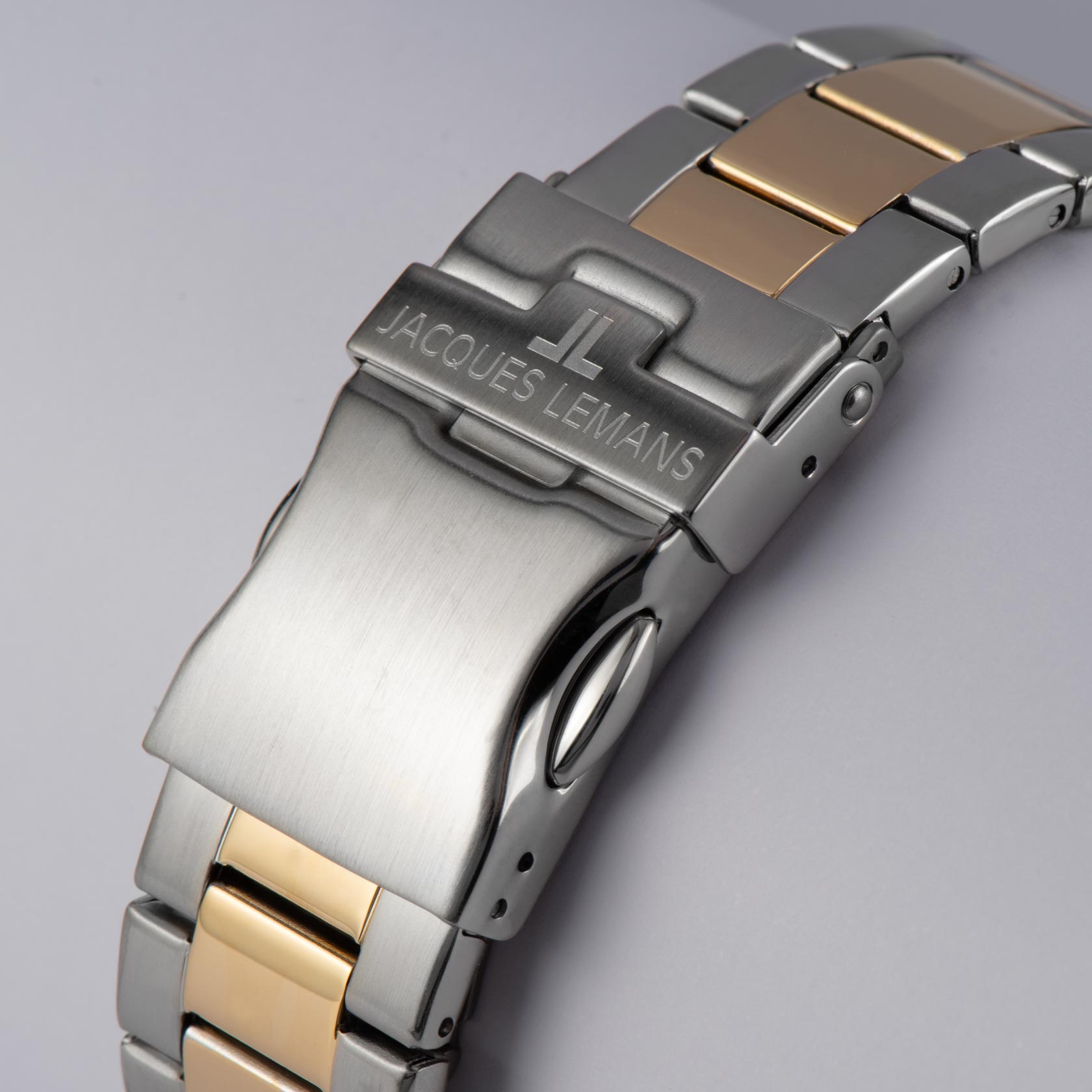 Часы серии Sport – надежный и функциональный аксессуар с хорошо читаемым циферблатом и точным кварцевым механизмом внутри 42-миллиметрового корпуса. Нержавеющая сталь, из которой сделан корпус, украшена PVD-покрытием из желтого золота и двумя видами полировки, матовой и зеркальной. Минеральное стекло Crystex защищает белый циферблат с двумя счетчиками, минутным и секундным, индикатором 24-х часов и окошком даты. В темноте часовая, минутная стрелки и крупные цифры от 1 до 12 позволят легко определить, который час: они излучают приятное для глаз свечение благодаря люминесцентному покрытию. Повышенная водостойкость модели составляет 10 атмосфер. Браслет из стальных звеньев с PVD-покрытием дополняет застежка-клипса с удобными боковыми кнопками и дополнительной защитой.