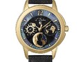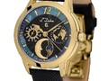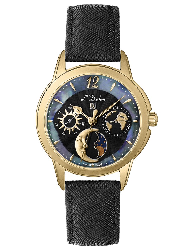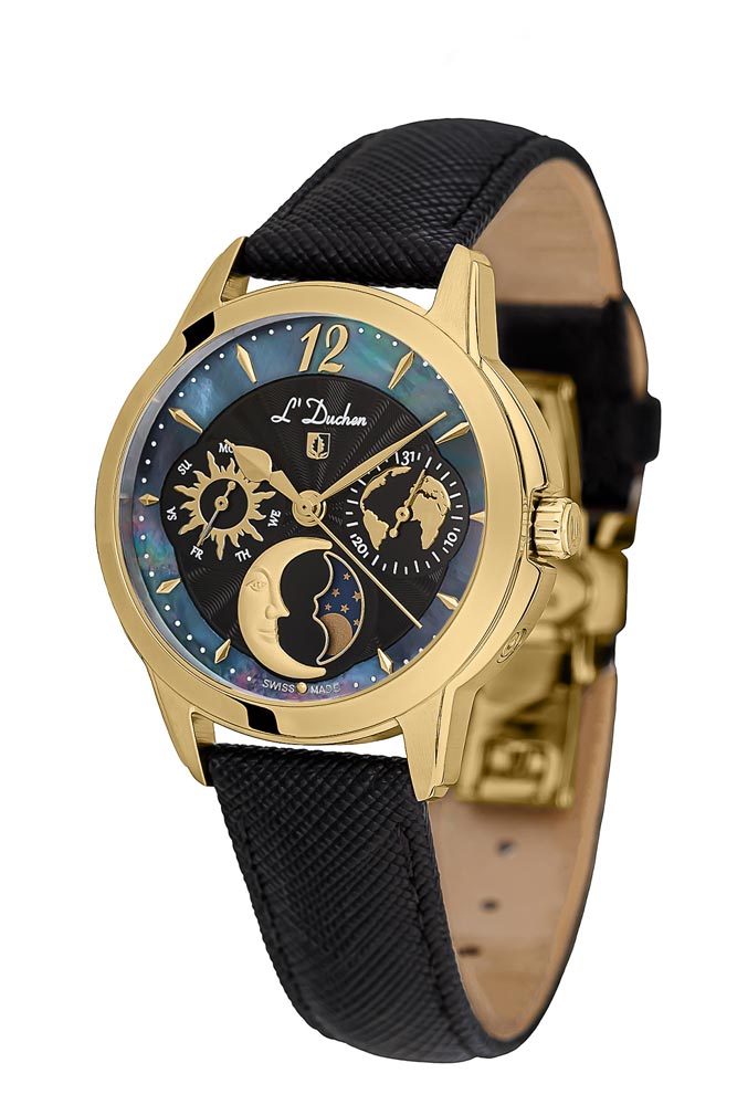 Кварцевый швейцарский механизм надежно скрыт в стальном 34-миллиметровом корпусе круглой формы с PVD-покрытием из желтого золота. Привлекает внимание сочетание матированных и полированных элементов на корпусе. Широкий полированный безель интересно играет на свету. Почти невидимое, но стойкое к появлению царапин, сапфировое стекло позволяет любоваться главной изюминкой модели — роскошным черным циферблатом. Центральная часть циферблата декорирована волнообразным гильоше. Индикатор дней недели представлен в виде солнечного диска, индикатор даты украшает изображение карты нашей планеты. Указатель лунных фаз элегантно выделен металлической рамкой и дополнен объемным элементом в виде месяца. И, конечно, неповторимость и уникальность часам придает кольцо из натурального перламутра по краю циферблата. Часы установлены на черном ремешке из натуральной кожи с сафьяновым тиснением и стальной раскладной застежкой «бабочка», украшенной логотипом бренда. День недели и месяц устанавливаются с помощью скрытой кнопки, которая находится сбоку на корпусе.