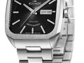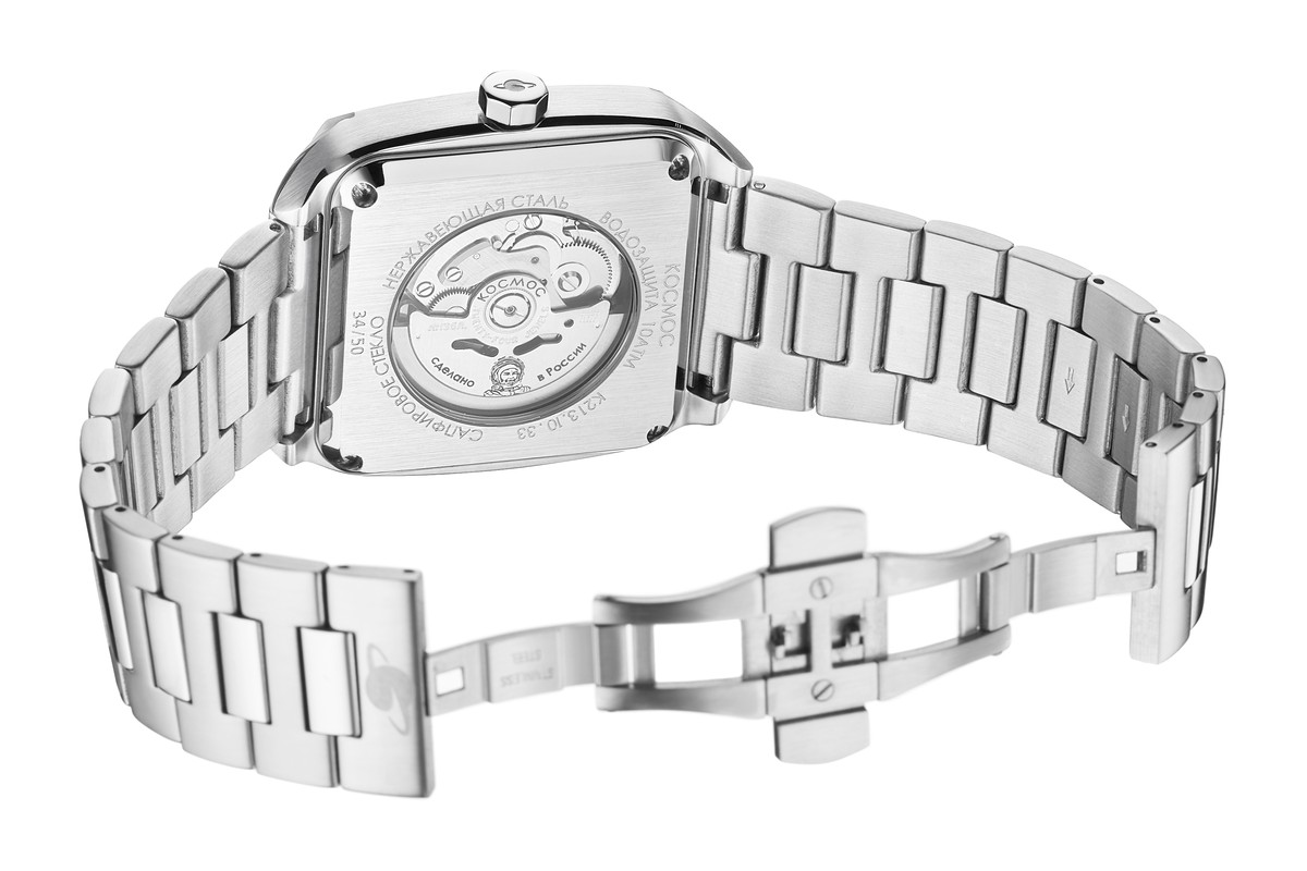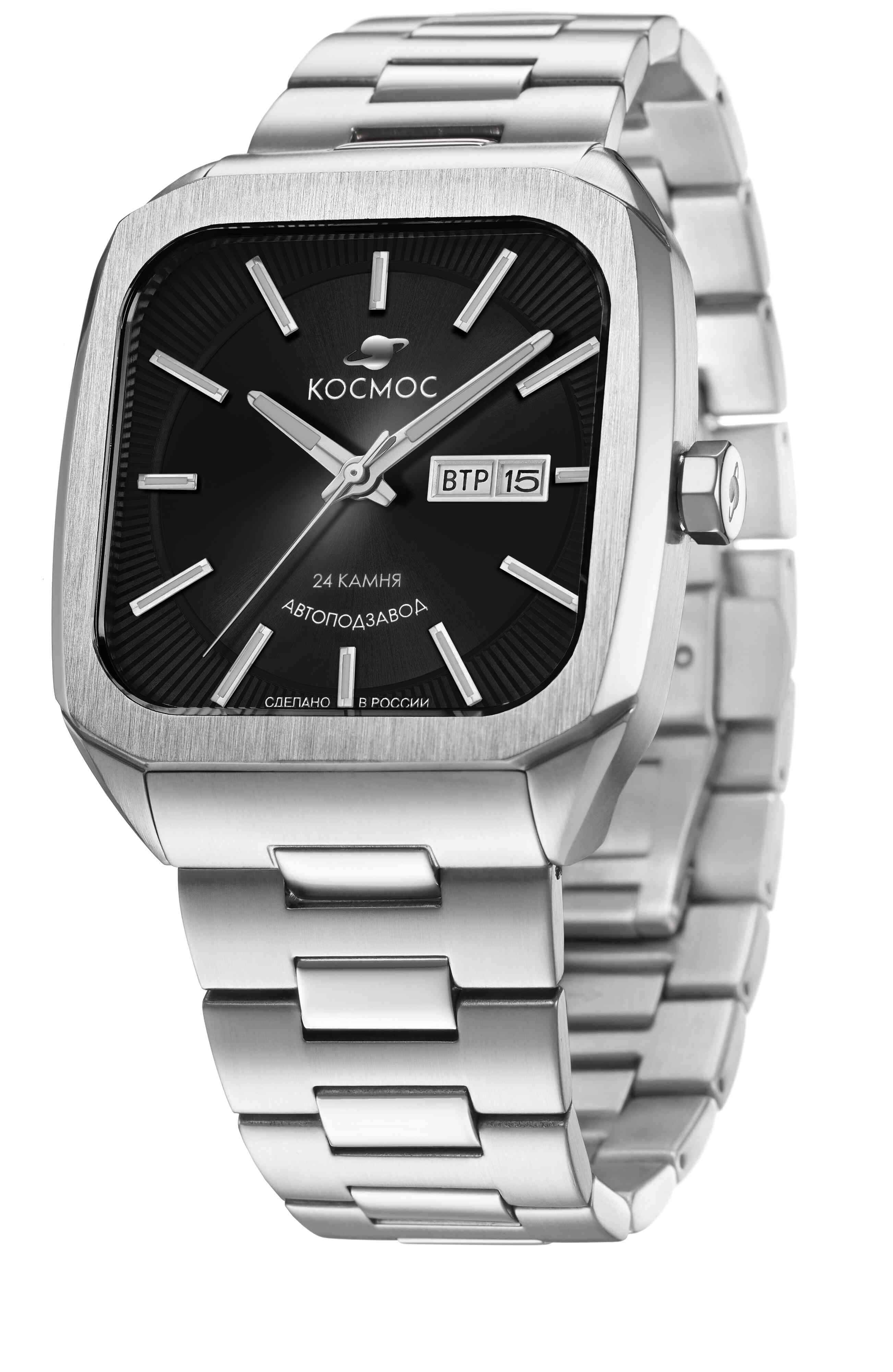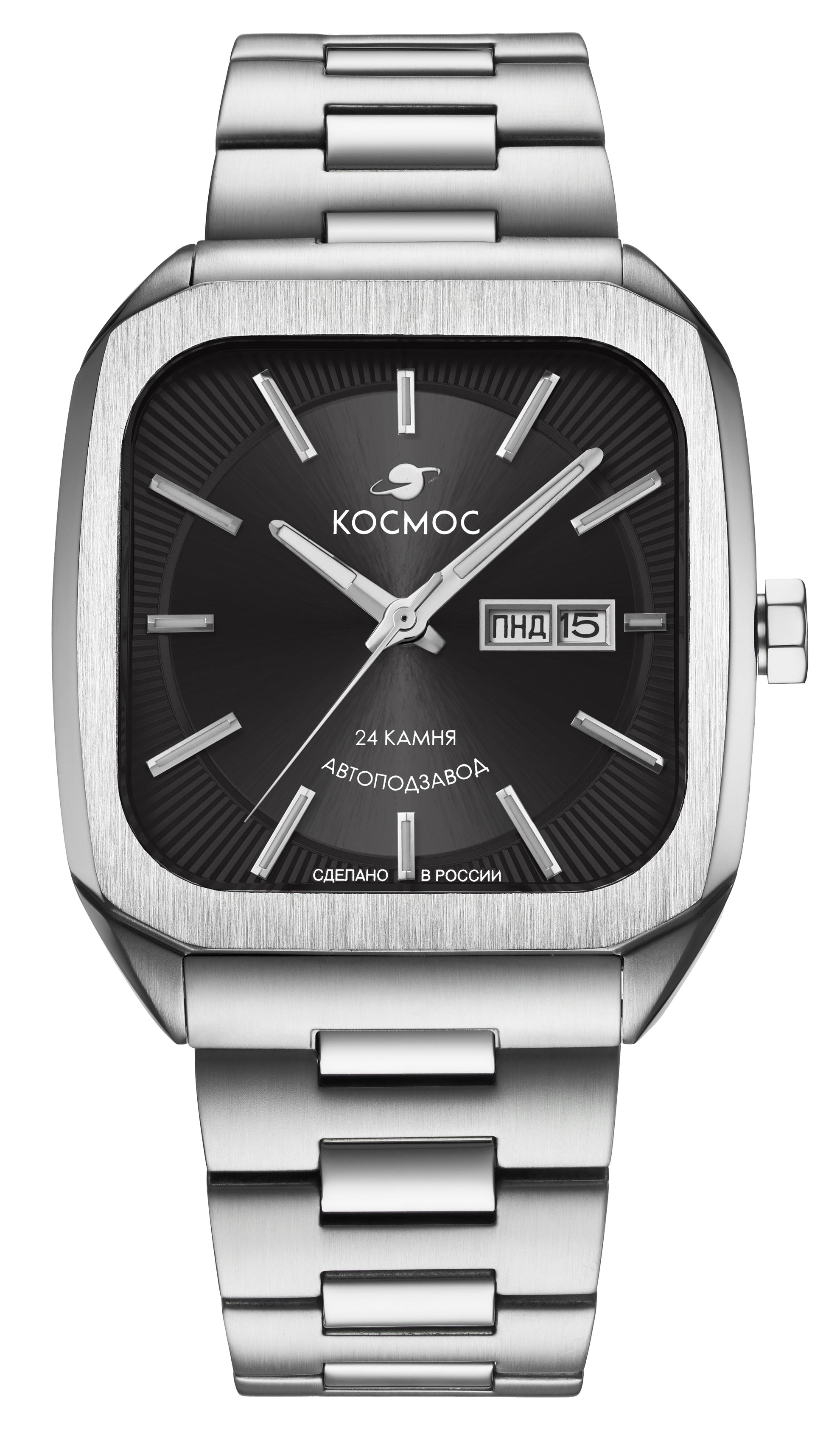 Корпус часов в форме квадрата с закругленными углами сделан из нержавеющей стали, украшенной зеркальной полировкой и сатинированием. Удобная заводная головка имеет форму гайки. Задняя крышка прозрачная, что традиционно для механических часов. Сквозь это специальное окошко можно увидеть работу механизма TMI. Его подвижный ротор не только позволяет заводить пружину механизма от обычных движений руки, но и несет важную информацию: на нем вы увидите надпись «Сделано в России». Украшением служит гравировка, изображающая космонавта. Задняя крышка крепится на четырех винтах, что обеспечивает повышенную водостойкость в 10 атмосфер (100 метров). Цифры в формате от 01/50 до 50/50 (первый выпуск) и от 051/200 до 200/200 (второй выпуск) обозначают индивидуальный номер модели. Ушки корпуса имеют эргономичную форму — это позволяет часам комфортно лежать на запястье. Объемный циферблат черного цвета состоит из двух уровней. В центре первого движутся три стрелки, часовая и минутная - с люминесцентным покрытием. Второй уровень декорирован гильоше в виде солнечных лучей. Индексы накладные, как и стальная рамка, выделяющая сдвоенное окошко даты и дня недели. Обратите внимание, что для индикации дня недели используется два языка: русский и английский. Сапфировое стекло с антибликовым покрытием обеспечивает защиту циферблата и хорошую читаемость показаний, независимо от условий видимости.