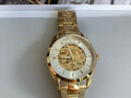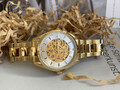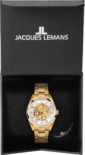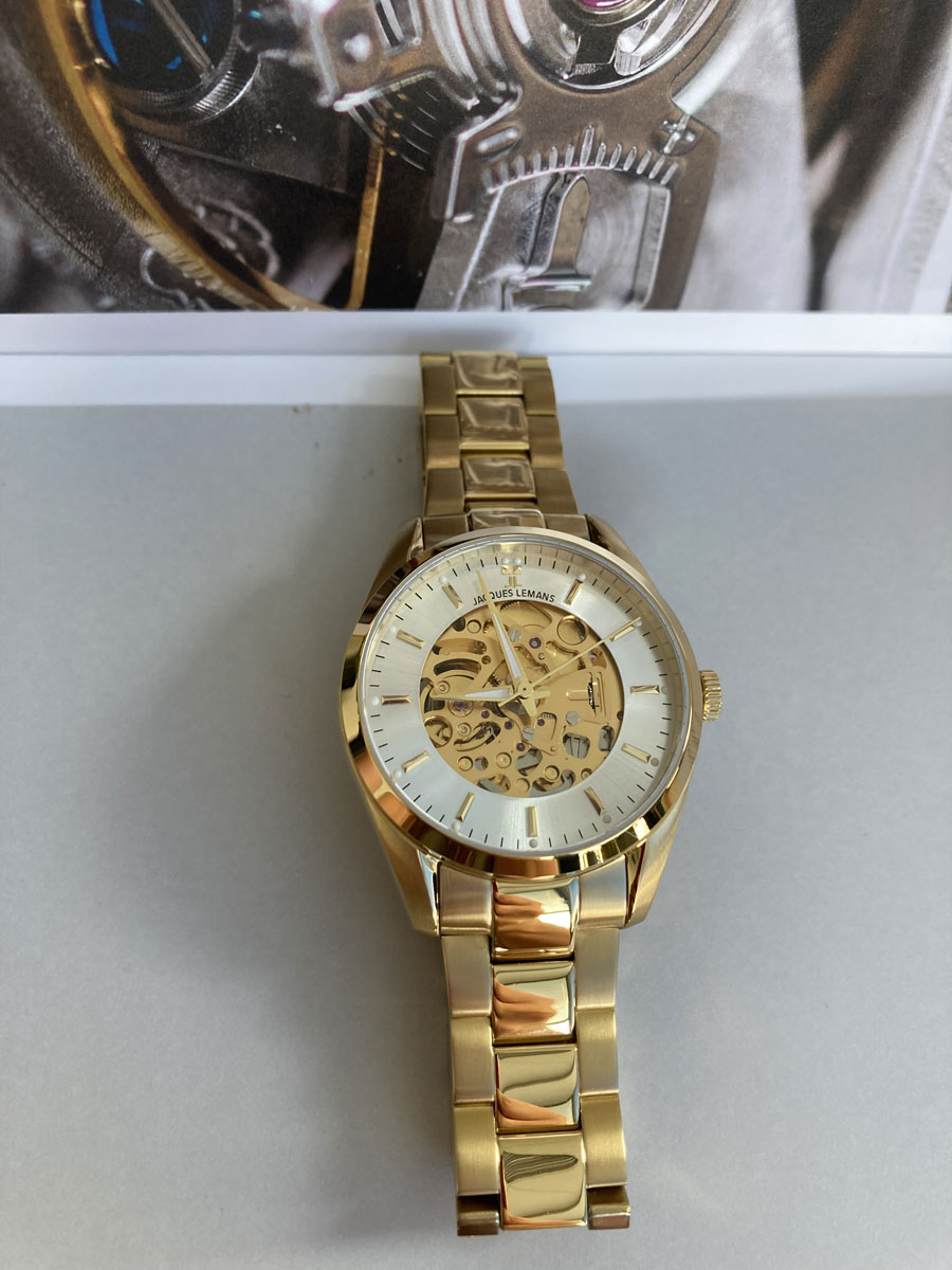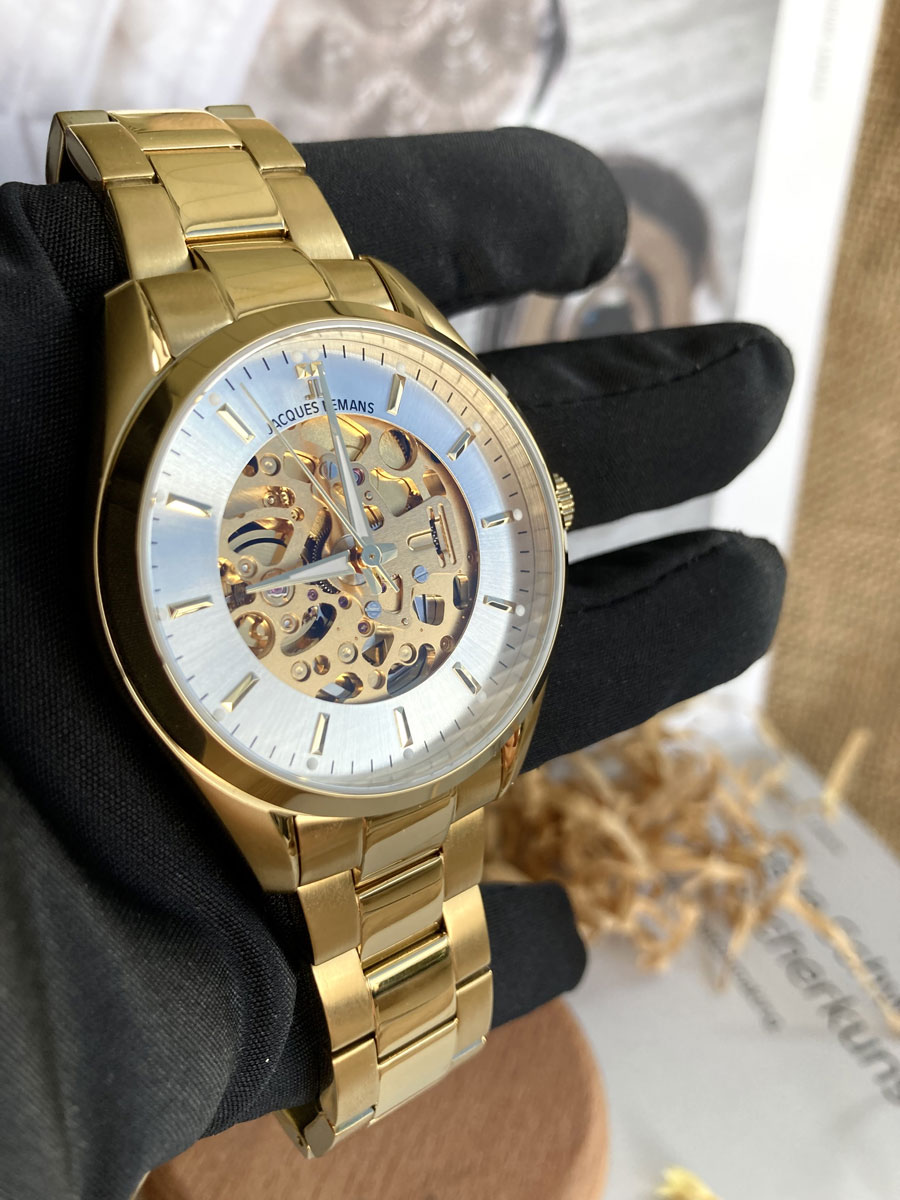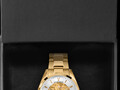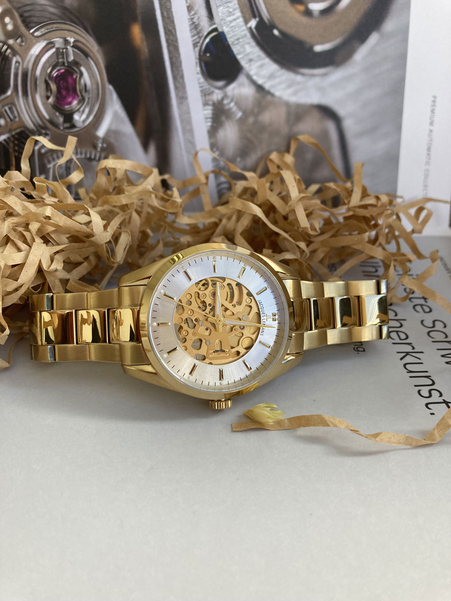 Корпус диаметром 40 мм сделан из прочной нержавеющей стали с гипоаллергенными свойствами. Ударопрочное минеральное стекло Crystex надежно охраняет часы от внешних воздействий. На браслет из литых стальных звеньев c PVD-покрытием из желтого золота установлена удобная в использовании застежка-клипса с дополнительной защитой.