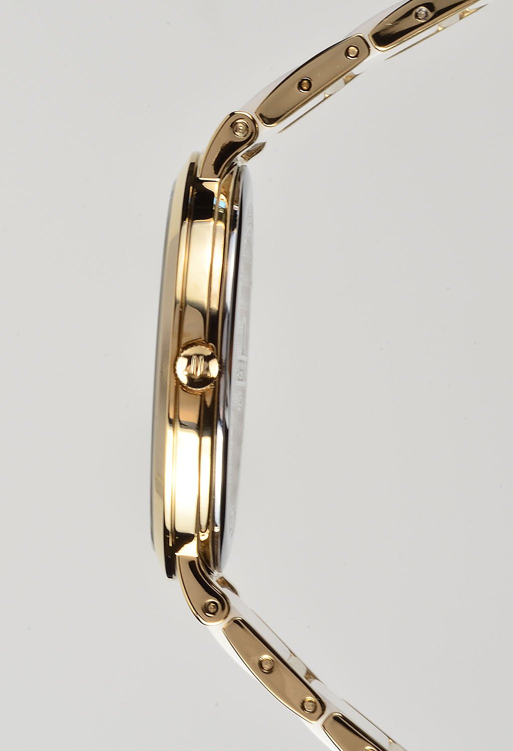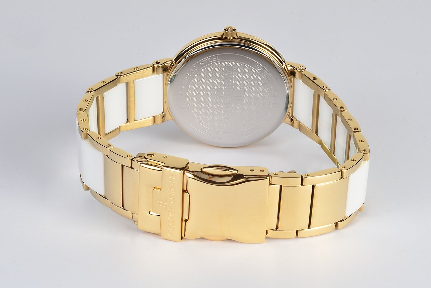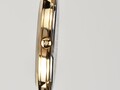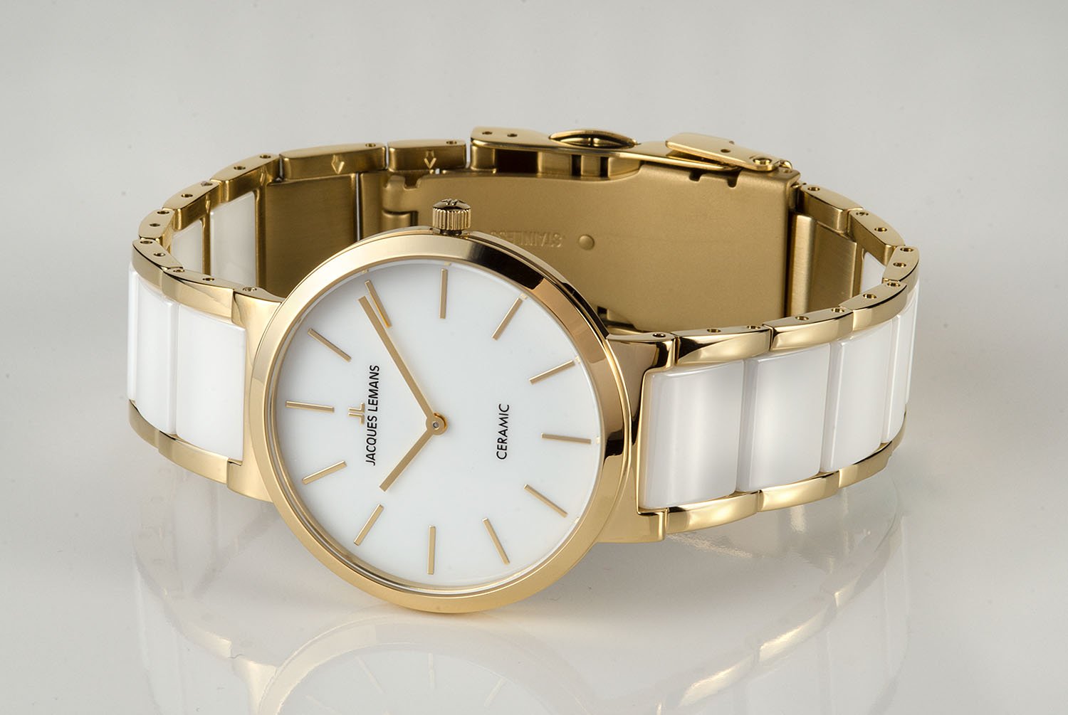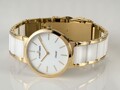Часы с ультратонким стальным корпусом c PVD-покрытием желтого цвета установлены на браслете, звенья которого выполнены из высокотехнологичной керамики белого цвета. Она снижает риск появления микроцарапин и сохраняет внешний вид часов. Браслет крепится на запястье с помощью надежной застежки с дополнительным фиксатором. Циферблат из натурального перламутра белого оттенка превосходно оттеняет блеск кристаллов Swarovski, из которых выполнены маркеры часов.