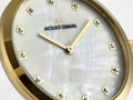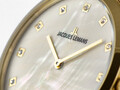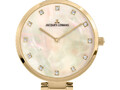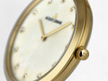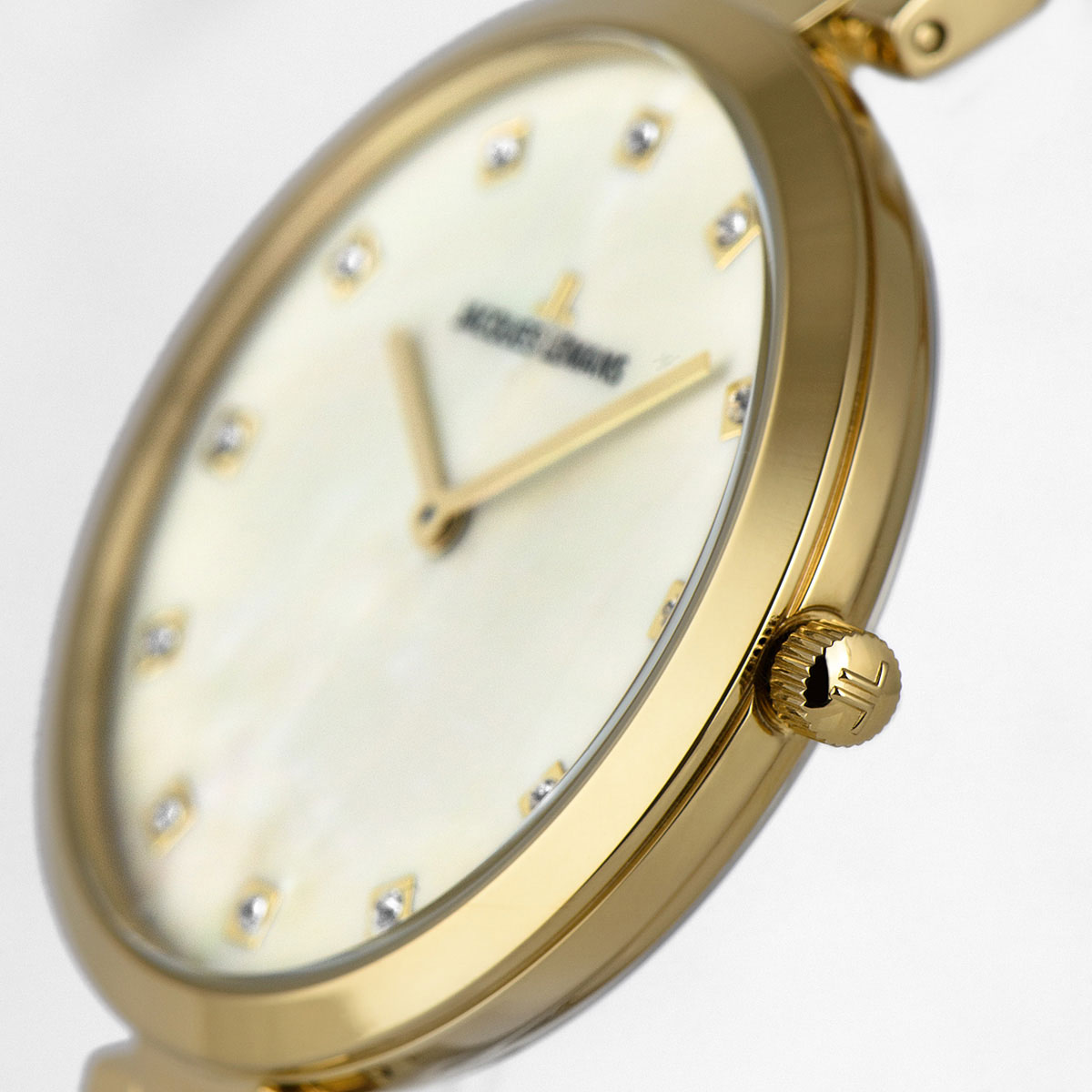 Корпус из прочной нержавеющей стали диаметром 36 мм с PVD-покрытием из желтого золота скрывает кварцевый механизм и эффектно обрамляет белый циферблат с пластиной из натурального перламутра.