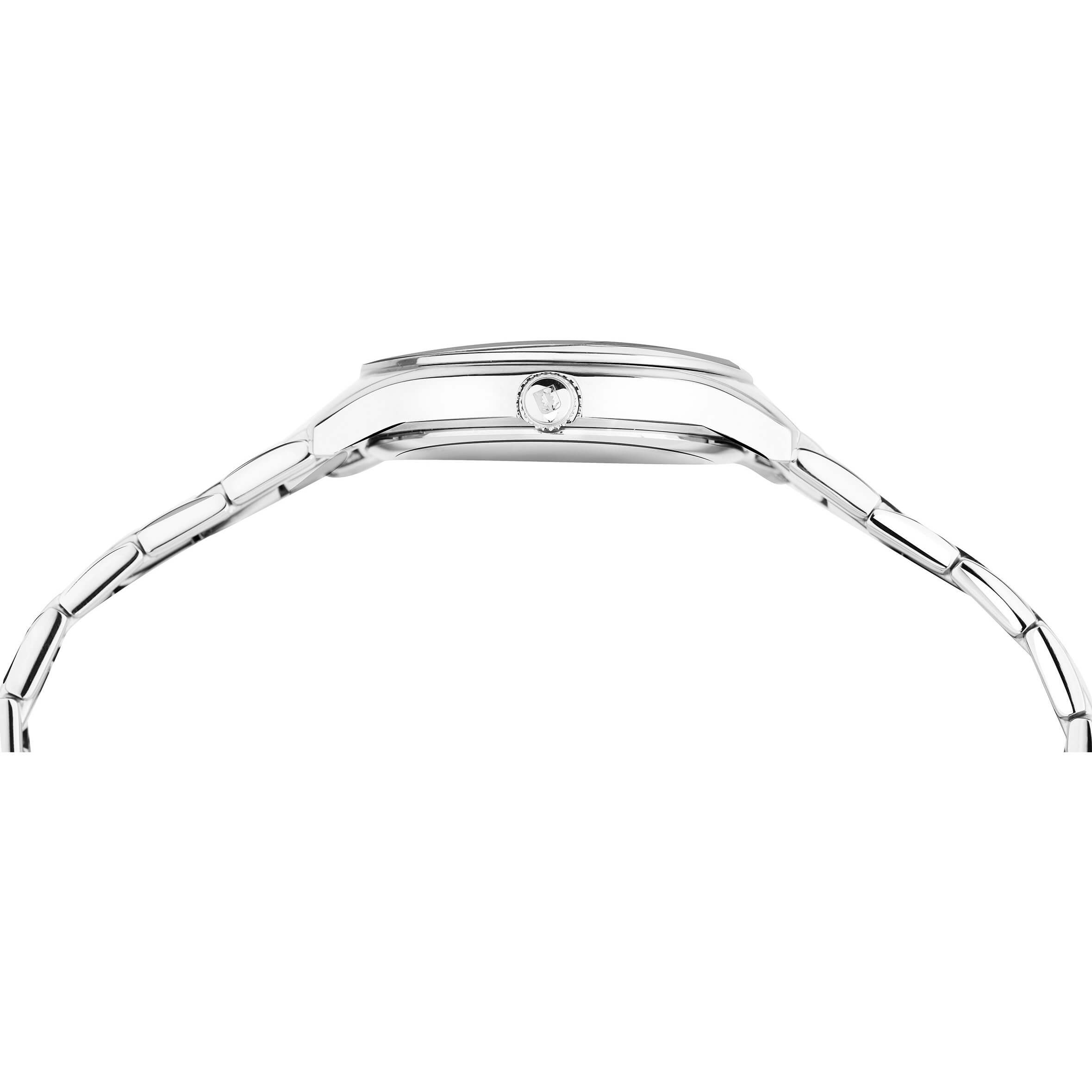 В часах используется швейцарский кварцевый механизм Ronda. Корпус часов из гипоаллергенной нержавеющей стали с эффектным чередованием матовых и полированных частей. Дополняет модель браслет, собранный из литых стальных звеньев. Надежная раскладная застежка-«бабочка» поможет предотвратить падение часов при случайном расстегивании.