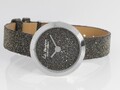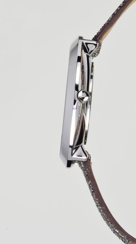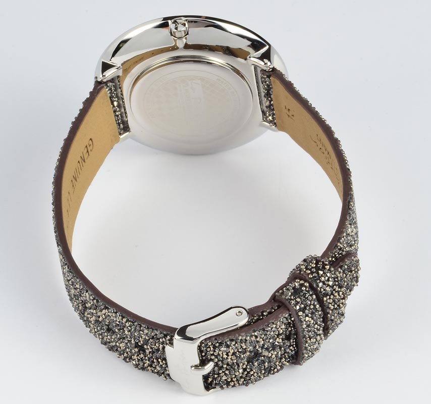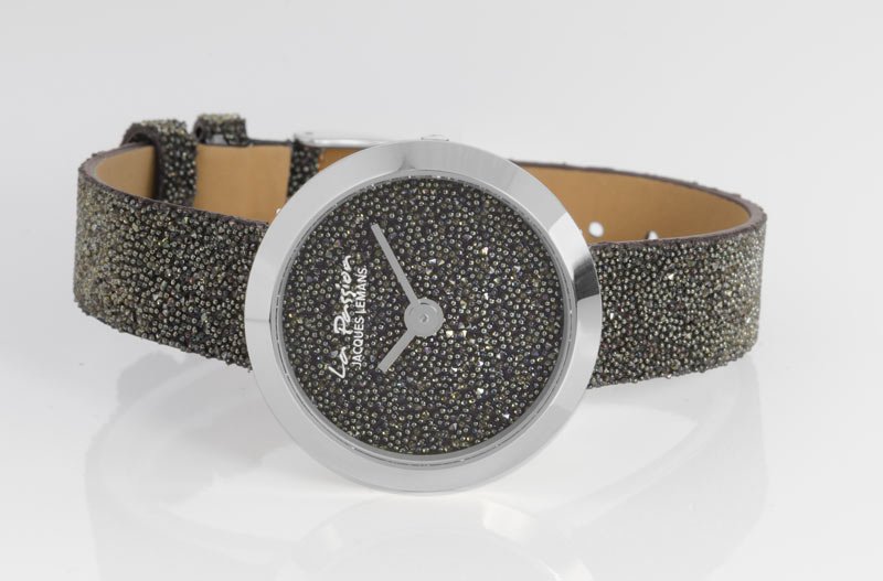 Дизайнеры Jacques Lemans создали совершенно ослепительную модель женских часов с необычным покрытием ремешка и циферблата. Секрет в том, что кристаллы закреплены под разными углами и свет искрится на их гранях при каждом, даже самом неуловимом, движении руки. А сочетание серого ремешка со стальным корпусом придает дополнительный шик часам. На циферблате размещены хорошо читаемые часовая и минутная стрелки. Заводная головка и застежка украшены логотипом бренда Jacques Lemans.