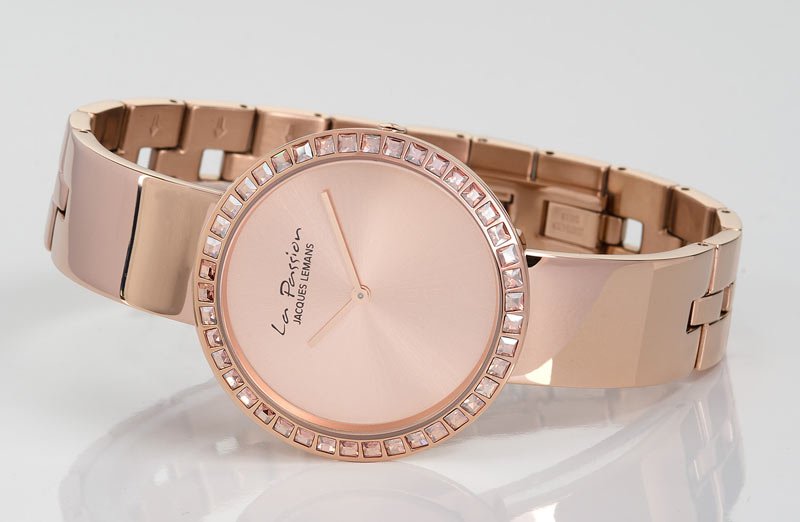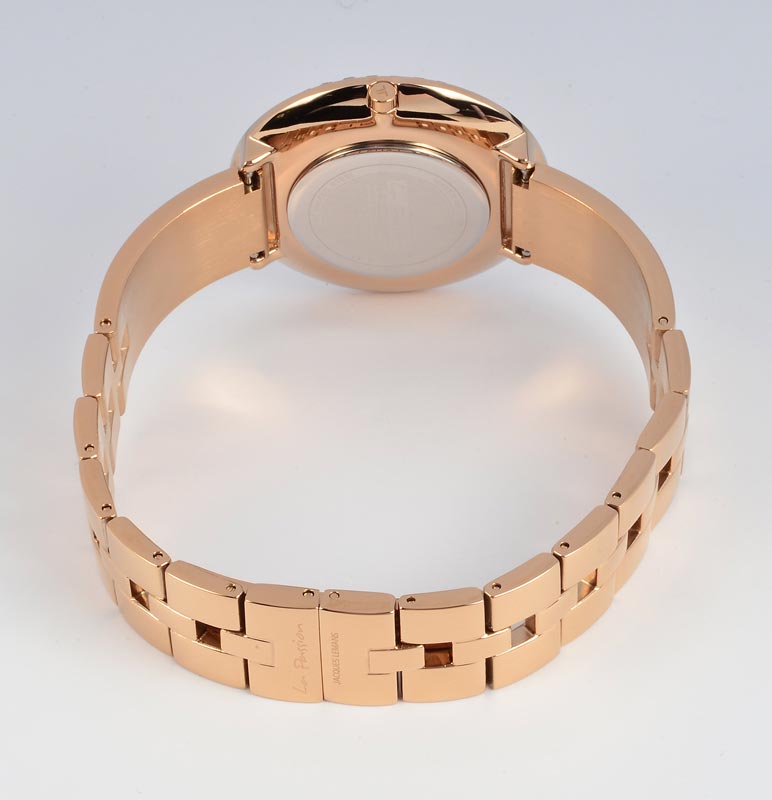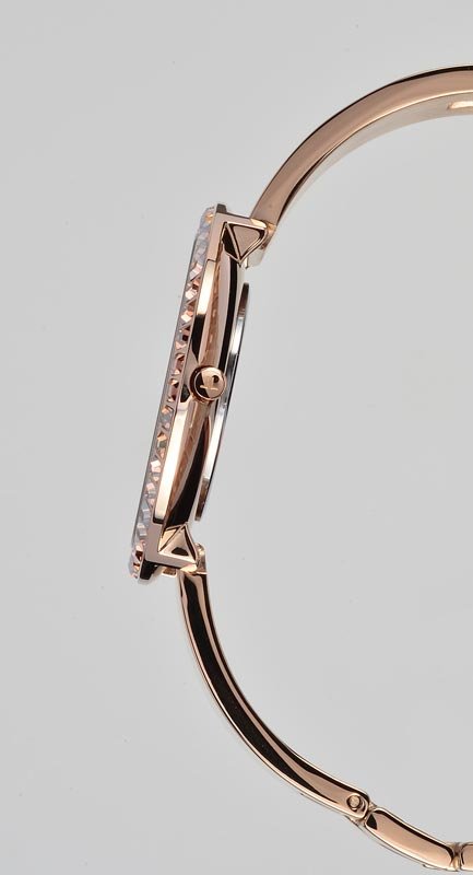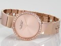 Изящный и хорошо читаемый циферблат модели коллекции La Passion обрамлен сверкающими кристаллами Swarovski. Интересен браслет часов, который дополняет тонкий и легкий корпус. Первое гладкое звено, полированное практический до зеркального блеска, удобно и плотно охватывает запястье благодаря изгибу. Браслет и корпус в этой модели изготовлены из гипоалергенной нержавеющей стали с PVD-покрытием розовое золото.