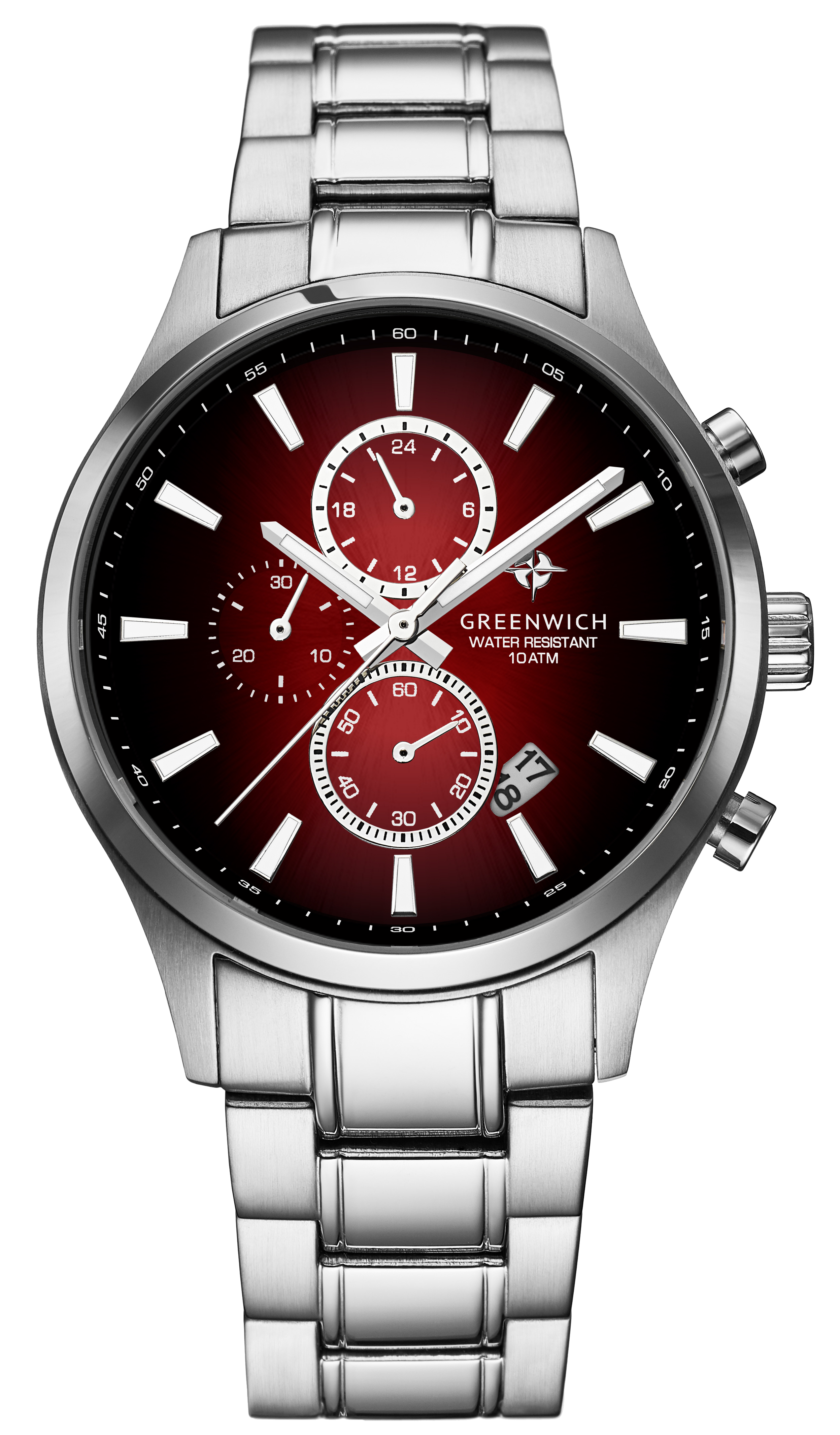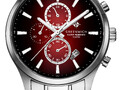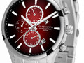 Кварцевый хронограф серии Navigator отличается вертикальной расстановкой дополнительных индикаторов на полированном циферблате с градиентом красного цвета.