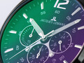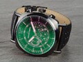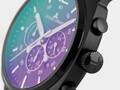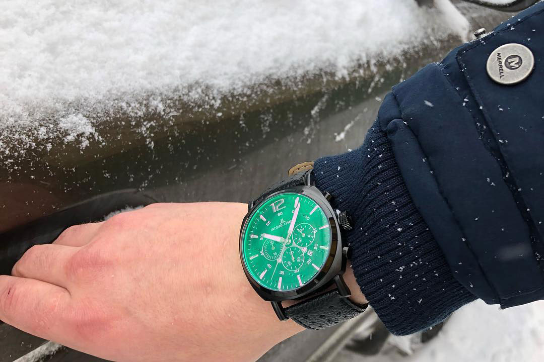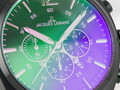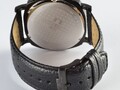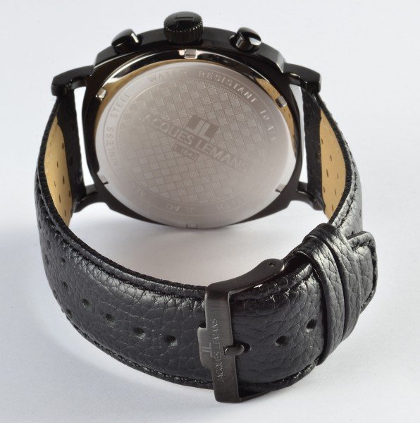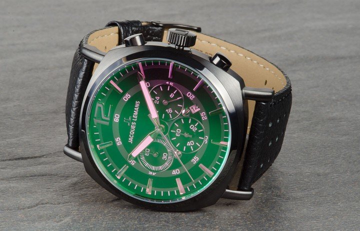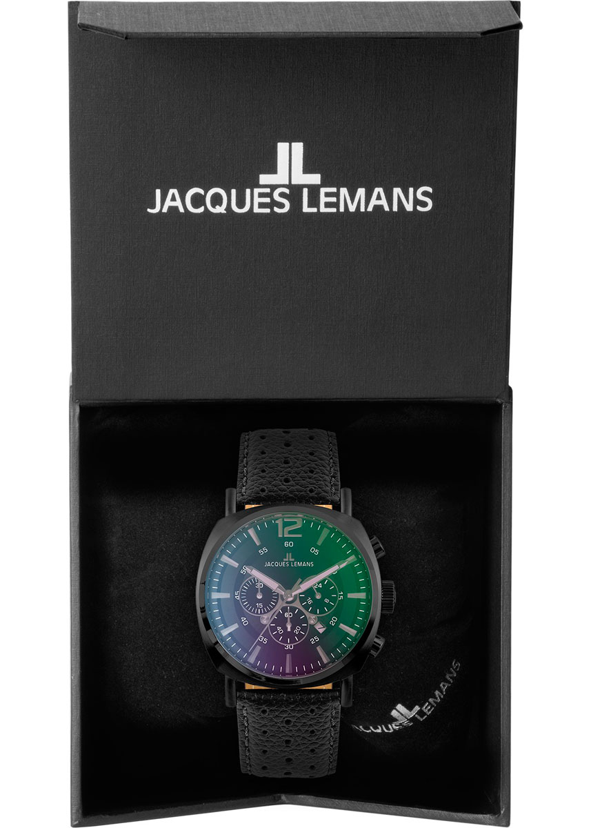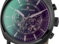 Стильный мужской кварцевый хронограф в стальном корпусе необычной формы. В центре циферблата дополнительный индикаторы 24-часов, 60-минутный накопитель, вынесенная секундная стрелка и окошко даты. Хорошо читаемые часовая и минутная стрелки покрыты специальным люминесцентным составом. В модели повышенная водозащита — 10 АТМ. На часах установлен черный ремешок из натуральной кожи с перфорацией.