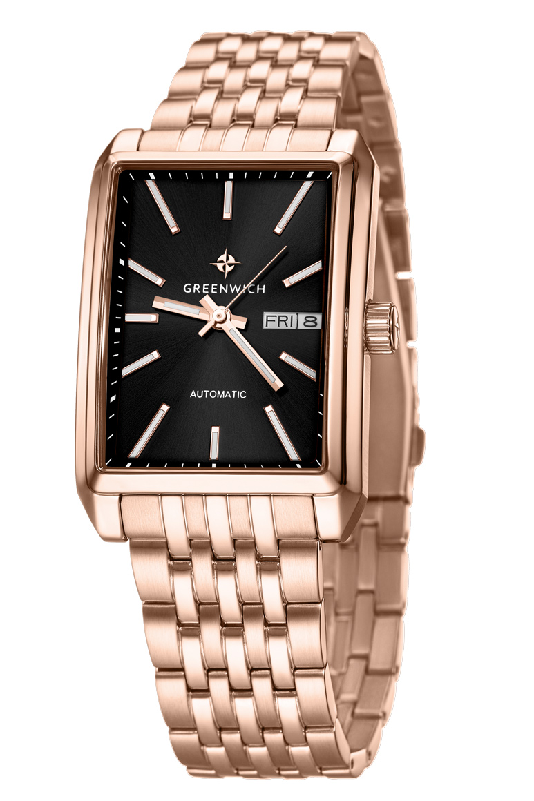 Любимая многими серия механических часов Greenwich представляет новинку: часы Caravel элегантном прямоугольном корпусе, который скрывает японский механизм Miyota с функцией автоподзавода. Черный циферблат хорошо читается при любых условиях видимости: часовая, минутная стрелки и накладные риски покрыты люминесцентным составом, который светится в темноте. На трех часах расположено окошко даты и дня недели. Корпус сделан из нержавеющей стали с PVD-покрытием из розового золота, задняя крышка прозрачная — можно наблюдать за работой механизма. Браслет тоже из стали, его структуру подчеркивает чередование зеркальной полировки и матирования на звеньях. Часы серии Caravel - универсальный и стильный аксессуар, не требующий замены элемента питания.