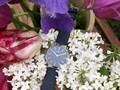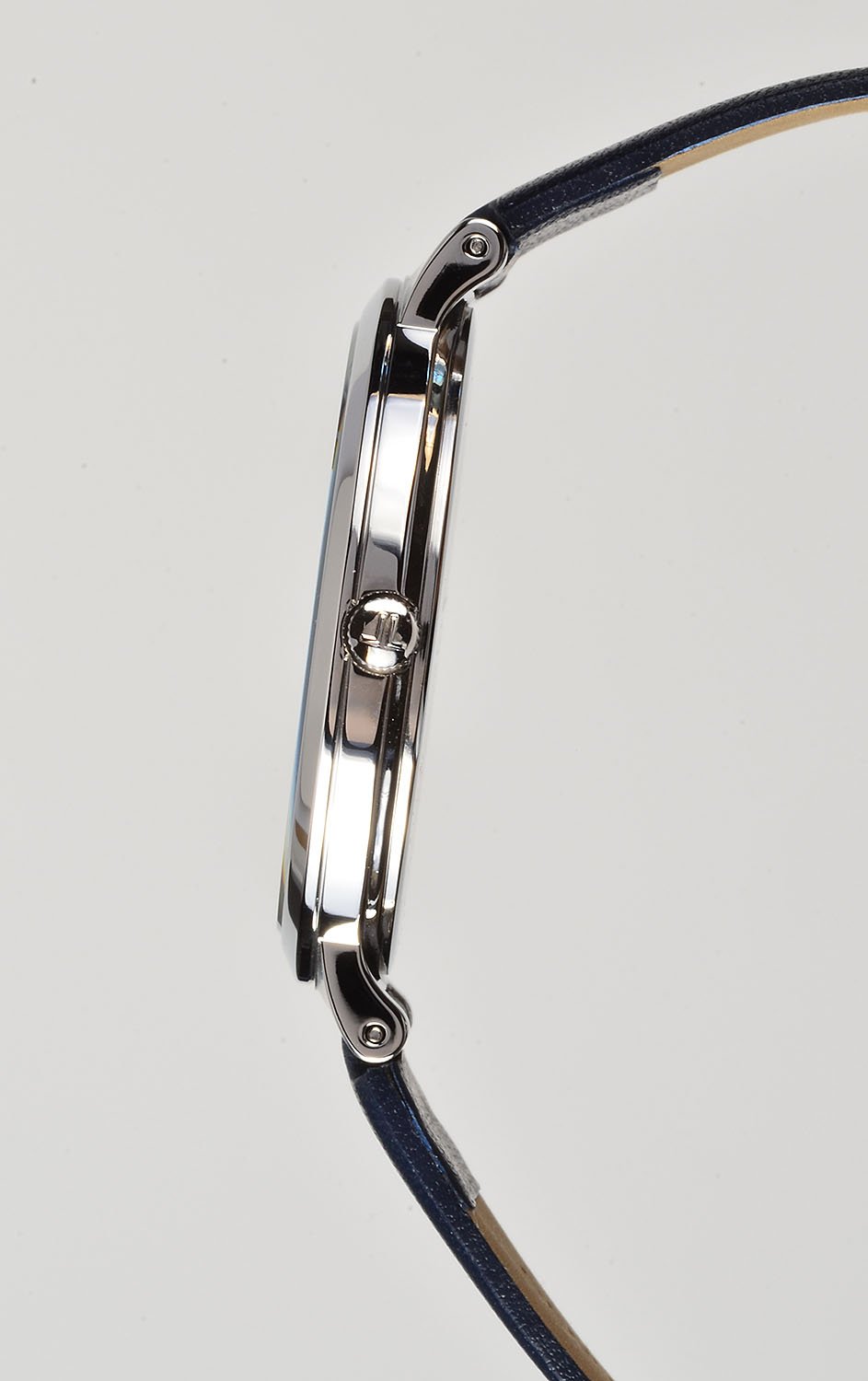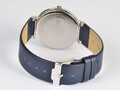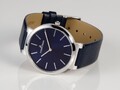 В дизайне этих кварцевых женских часов прежде всего привлекает внимание отсутствие лишних деталей на синем циферблате. Прямые линии часовой и минутной стрелок дополняют строгие стальные риски. Ремешок синего цвета из натуральной кожи изящно крепится к стальному корпусу.