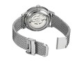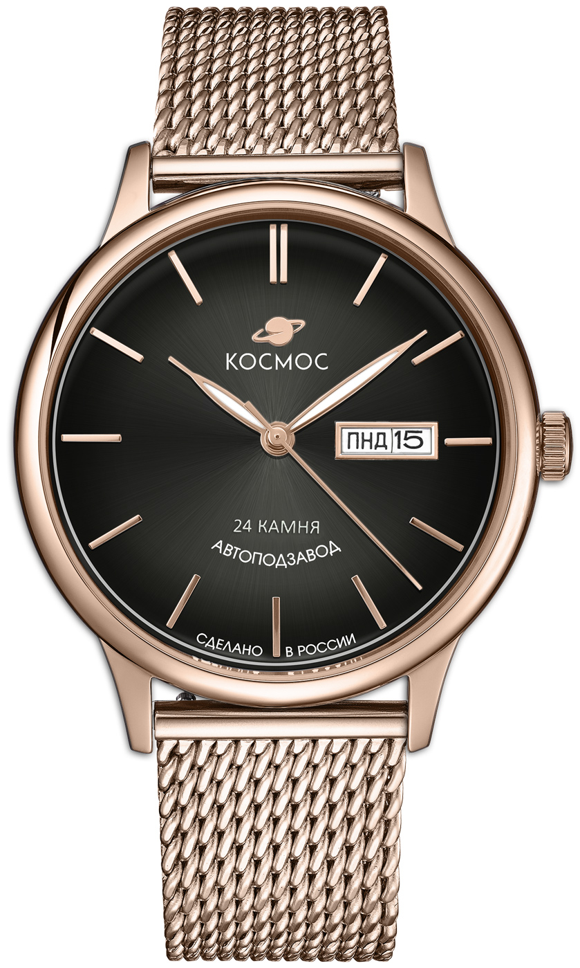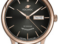 Индикация часов и минут обеспечивается хорошо читаемыми стрелками. Секундная стрелка выгнута и вторит форме циферблата. В позиции «3 часа» расположены окошки дня недели и даты. В модели тонко сочетаются стальные элементы и детали с PVD-покрытием из розового золота.