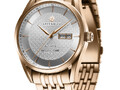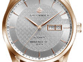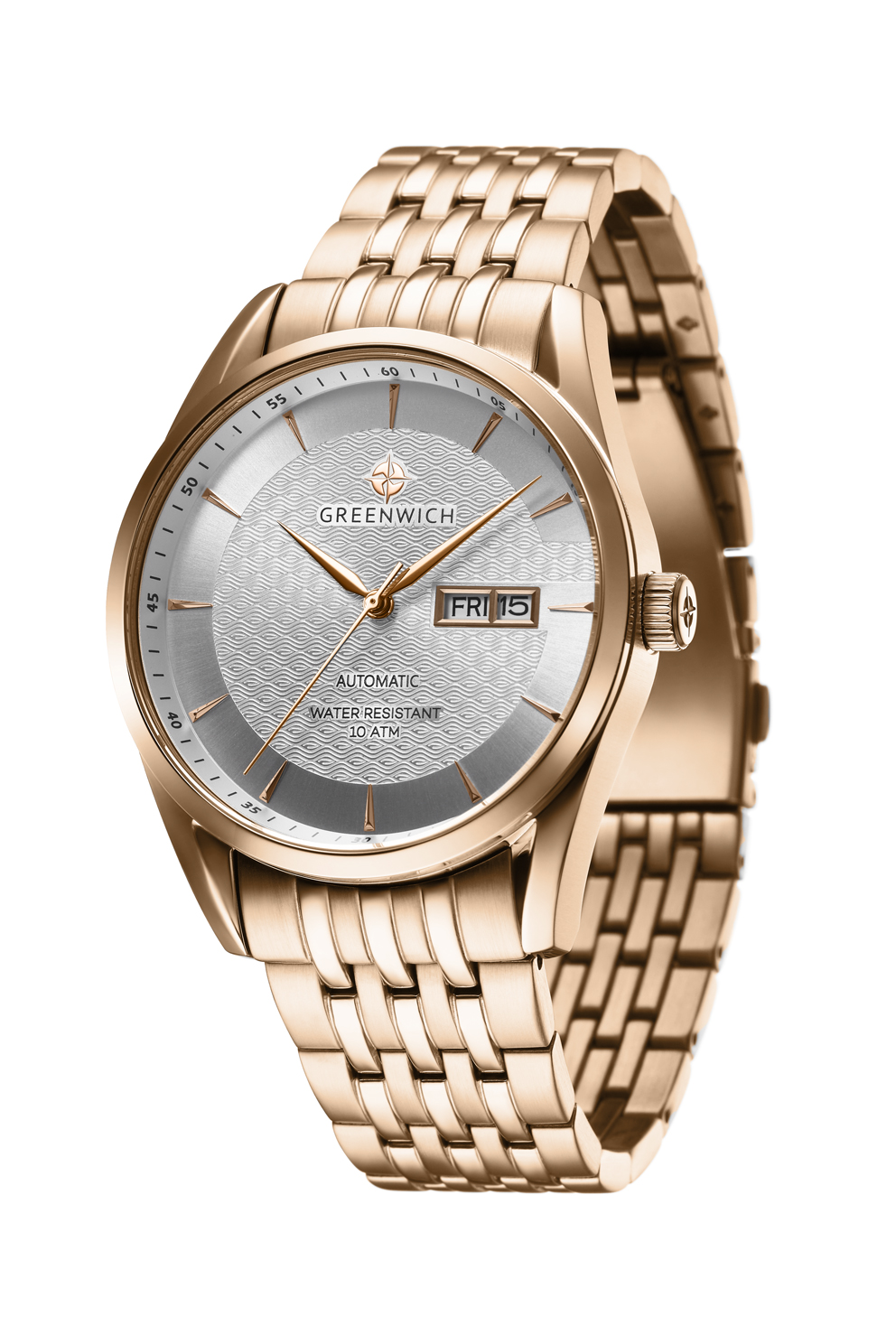 Серия Good Luck Classic входит в коллекцию автоматических часов бренда Greenwich. Классический корпус диаметром 42 мм с PVD-покрытием из розового золота и безелем с зеркальной полировкой обрамляет белый циферблат часов. В центральной части циферблата — отличительная черта моделей этой серии: гильоше, объемные линии которого напоминают волны. Обратите внимание на форму пластины, где крепятся накладные риски: она сделана в форме латинской буквы G, первой буквы в названии бренда. Водостойкость равна 10 атмосфер: в этих часах можно плавать. Сквозь прозрачную заднюю крышку вы увидите детали механизма TMI с декорированным ротором: на нем выгравировано изображение символа английских моряков — парусника. Браслет и застежка-клипса выполнены из гипоаллергенной нержавеющей стали. Дизайн, актуальный для любого современного образа, и надежность используемых материалов делают автоматические часы Greenwich удобным и стильным аксессуаром на каждый день.