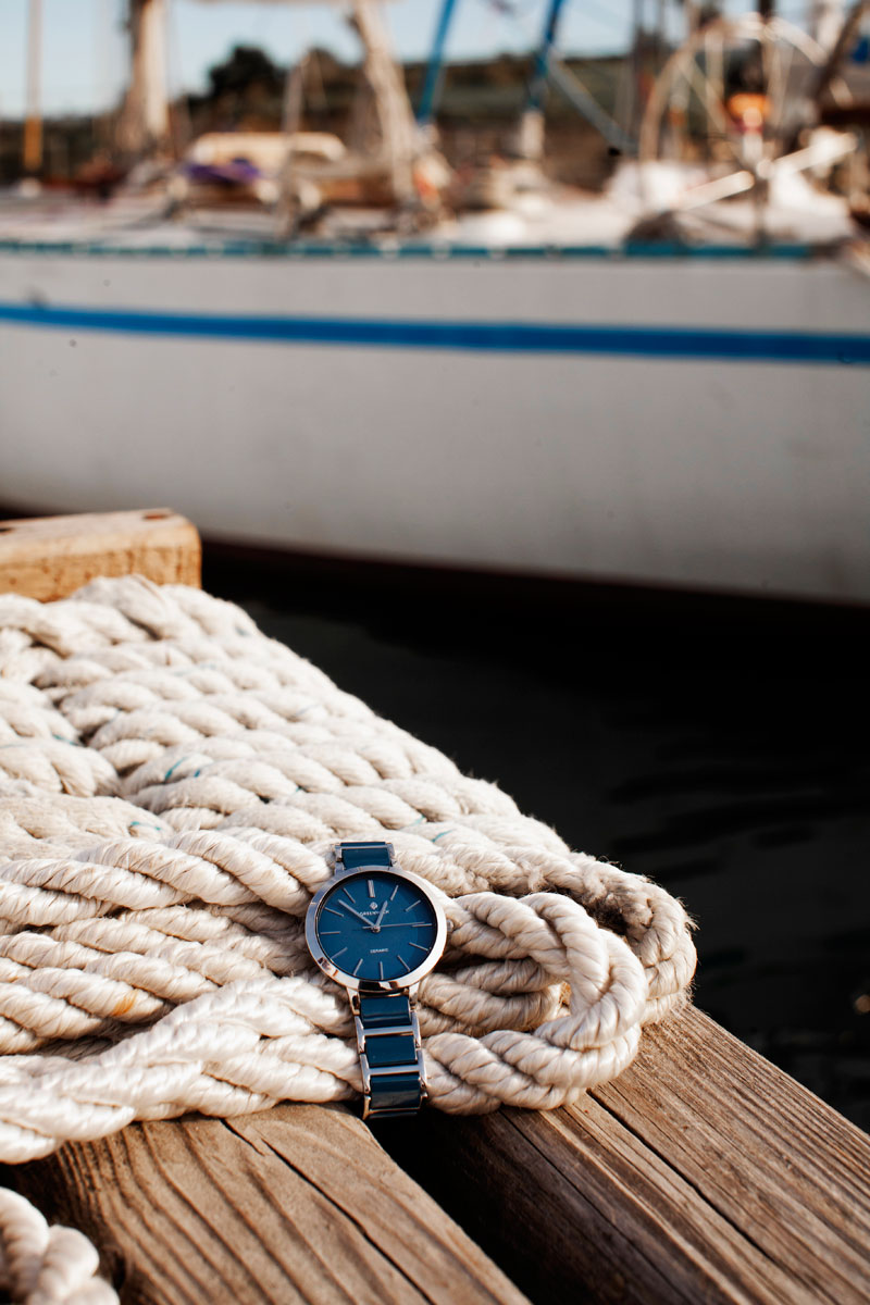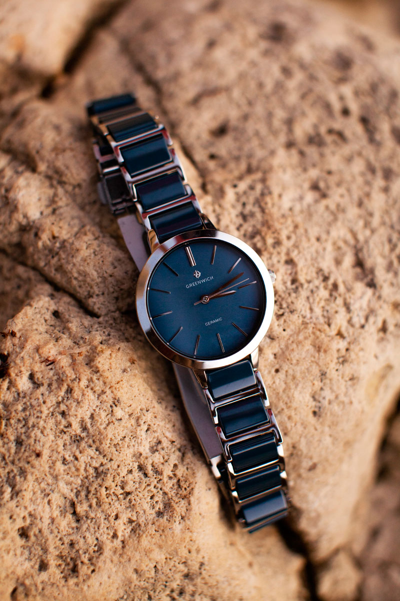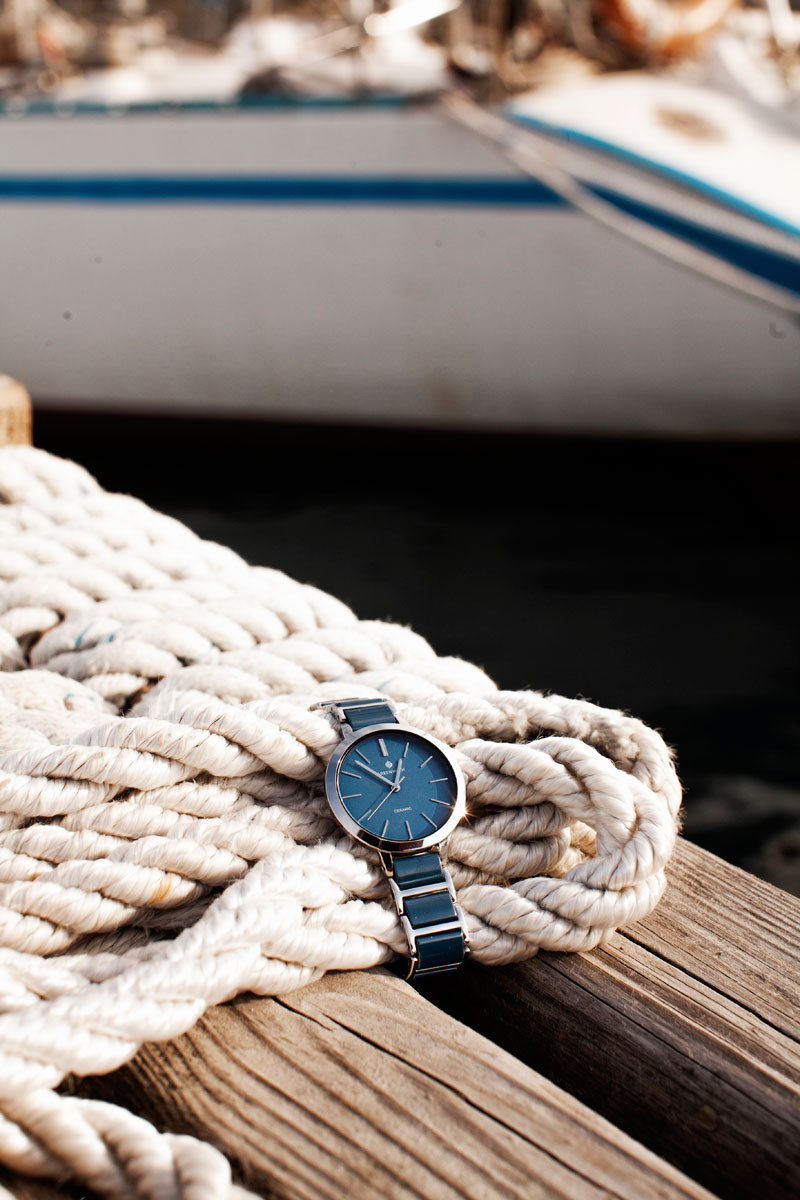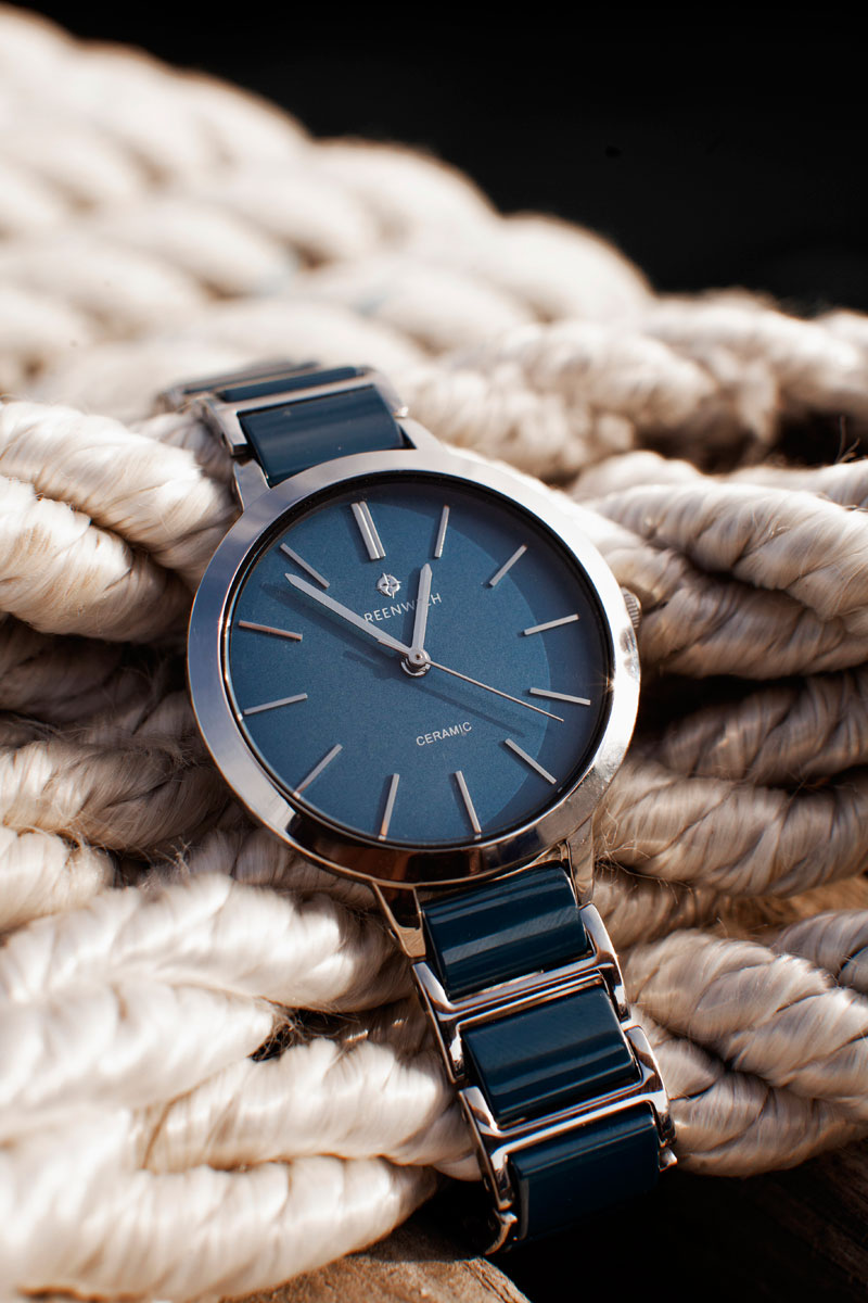 Браслет состоит из двух частей: полированное обрамление из нержавеющей стали и звенья синего цвета из высокотехнологичной керамики. Благодаря такому сочетанию браслет надолго сохранит первоначальный внешний вид (керамика известна своей стойкостью к появлению микроцарапин, а стальные элементы защищают ее от соприкосновения с поверхностями).