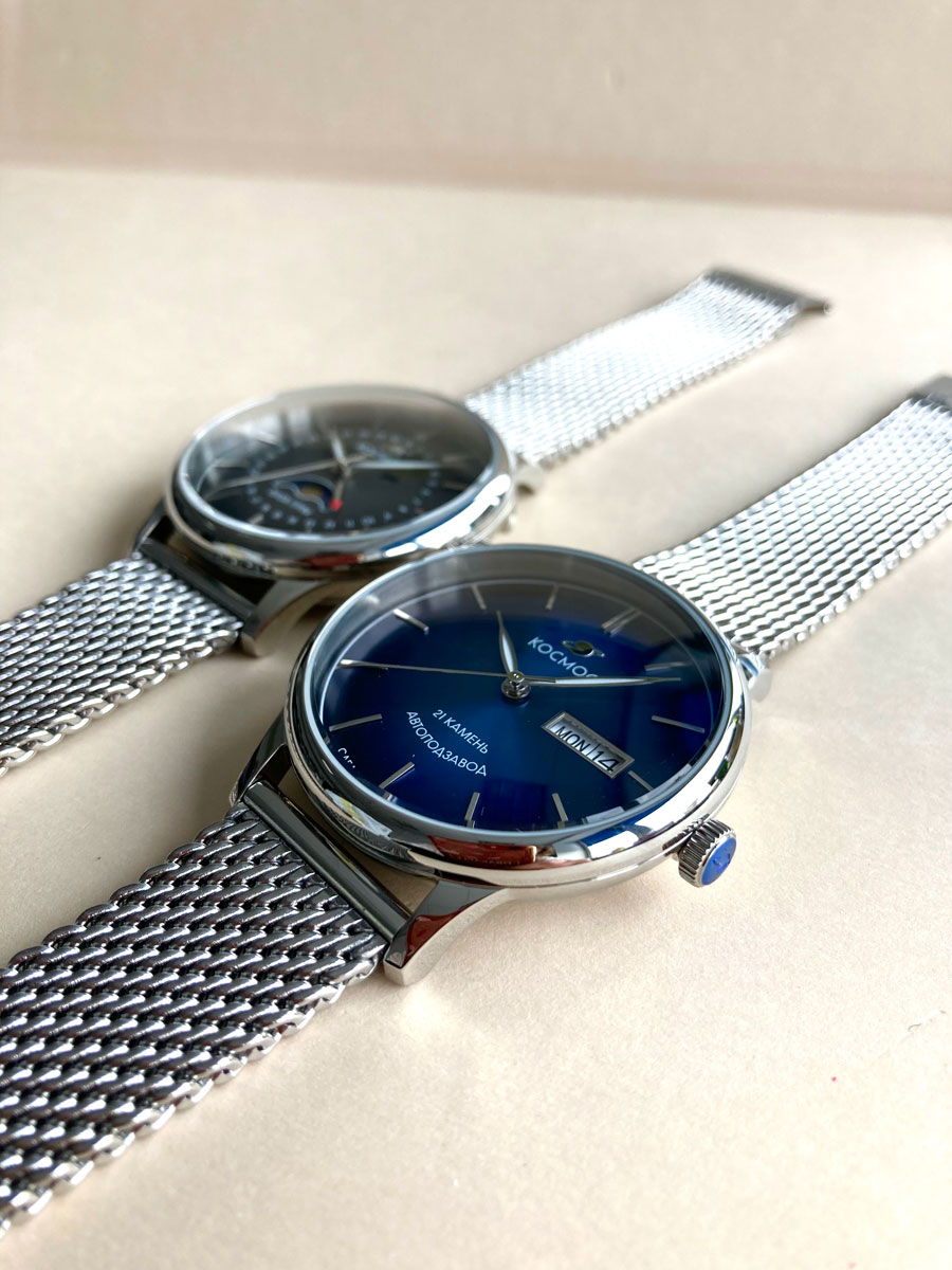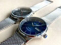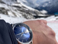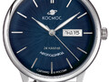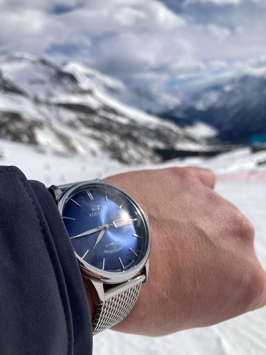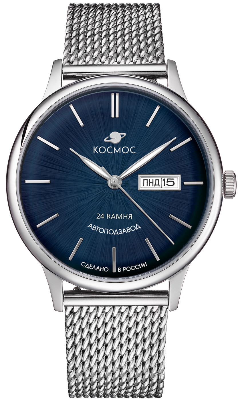 Особую глубину циферблату насыщенного синего цвета придает эффект градиента. Индикация часов и минут обеспечивается хорошо читаемыми стрелками. Секундная стрелка выгнута и вторит форме циферблата. В позиции «3 часа» расположены окошки дня недели и даты. Прозрачная задняя крышка демонстрирует точную работу механизма с автоподзаводом.