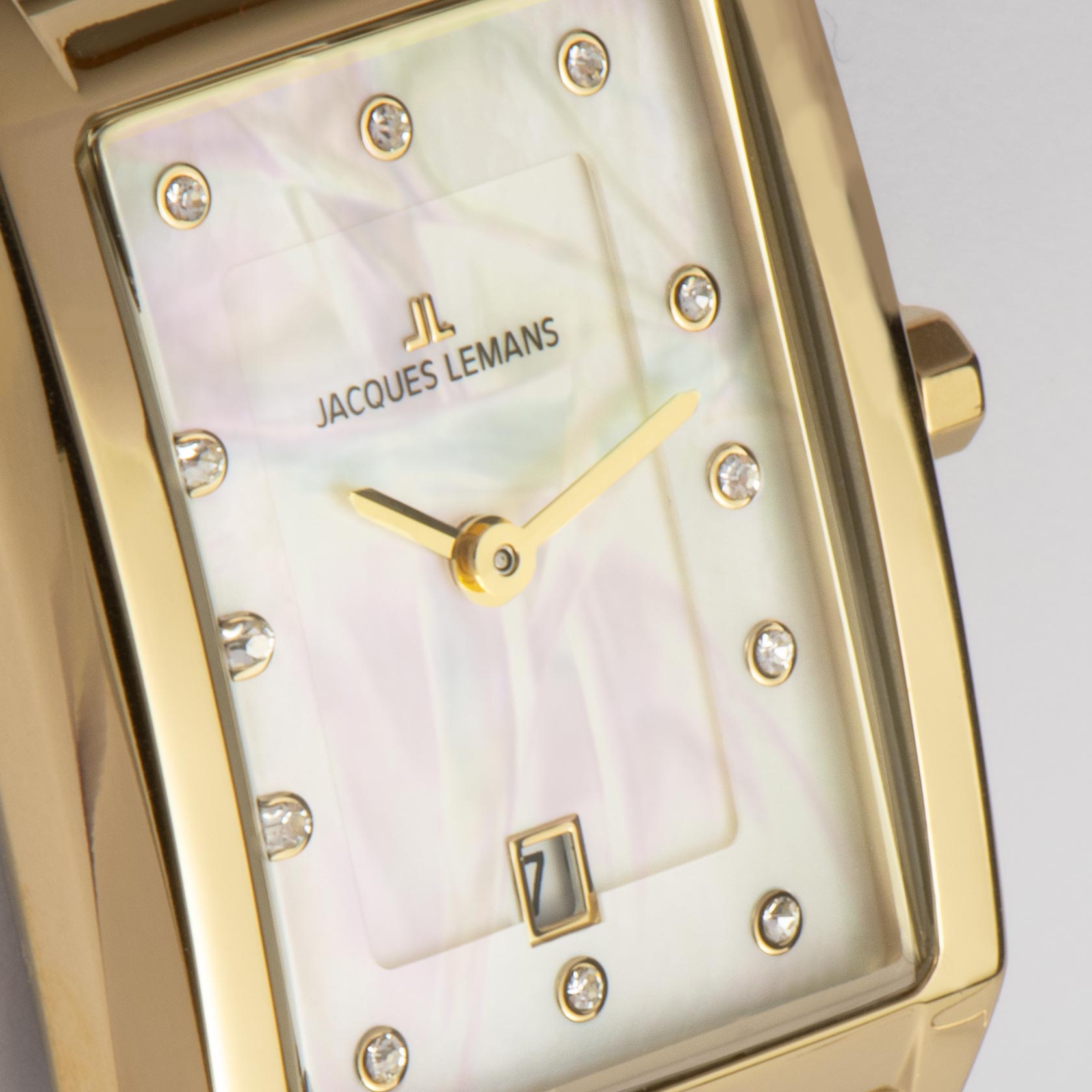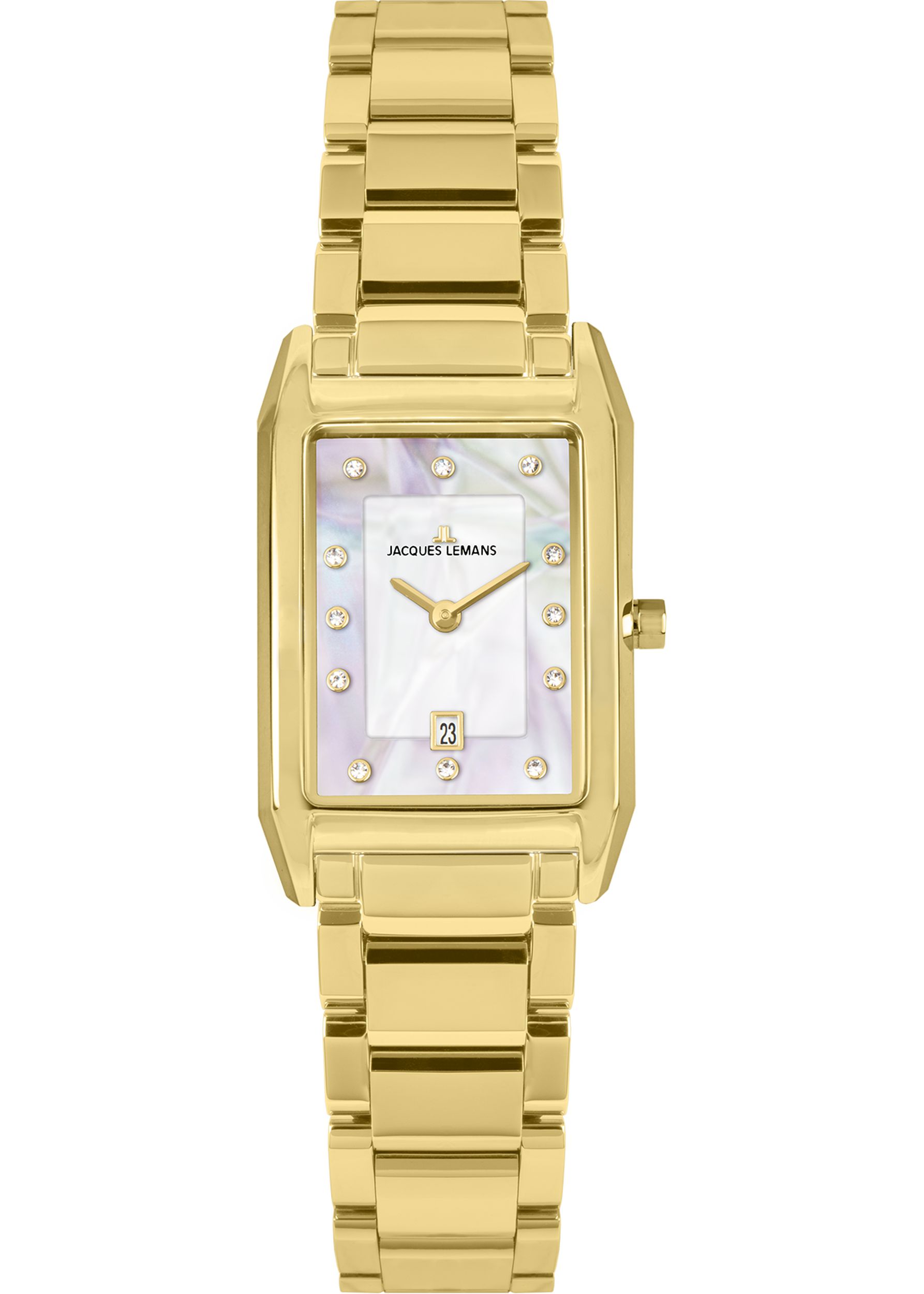 Прямоугольный корпус часов 1-2189 размером 23 на 35 мм будет украшать любое, даже самое изящное запястье. Он сделан из гипоаллергенной нержавеющей стали с PVD-покрытием из желтого золота и зеркальной полировкой. Белый циферблат состоит из двух пластин, выполненных из натурального перламутра. Двенадцать кристаллов Swarovski исполняют роль маркеров часов. Кварцевый японский механизм демонстрирует точное время и текущую дату. В модели установлено минеральное стекло. Браслет собран из стальных звеньев с PVD-покрытием из желтого золота, удобная в использовании застежка-клипса надежно удерживает аксессуар на руке.