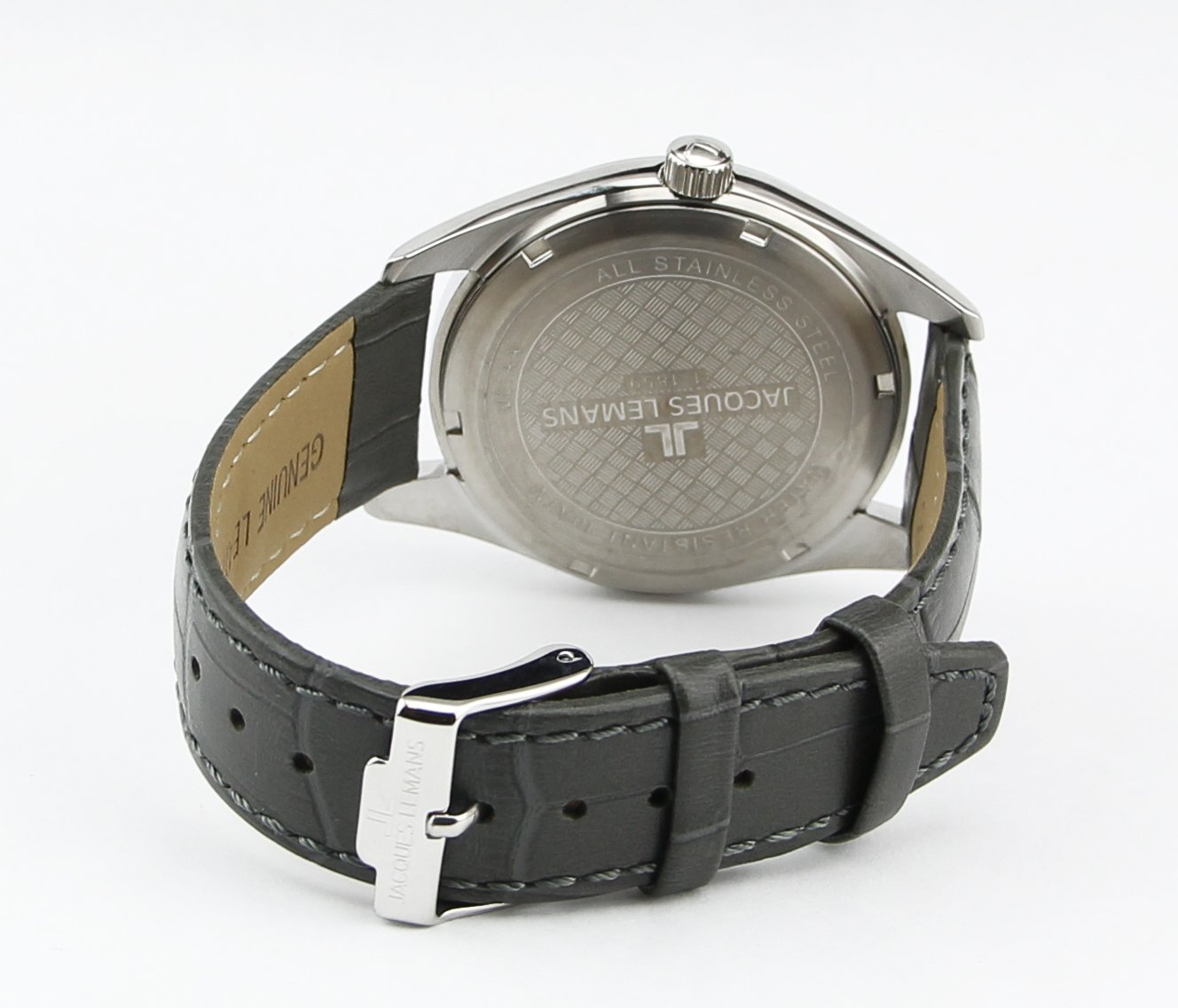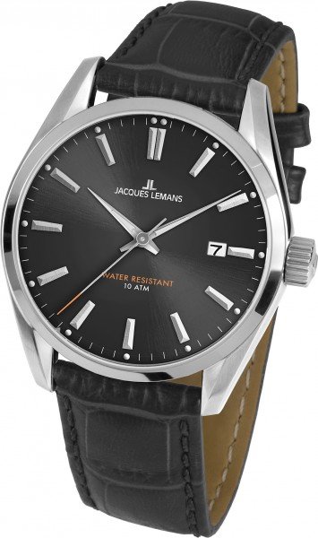 Тонкий стальной корпус мужских часов классической серии Jacques Lemans надежно защищает точный кварцевый механизм. Сразу привлекает внимание цвет полированного циферблата, выполненного в графитовом цвете. Помимо индикации времени (часовая, минутная, секундная стрелки), в положении «3» часа расположен индикатор даты. Обратите внимание на водостойкость. В данной модели она повышенная и составляет 10 АТМ. Часы дополняет ремешок из черной натуральной кожи.